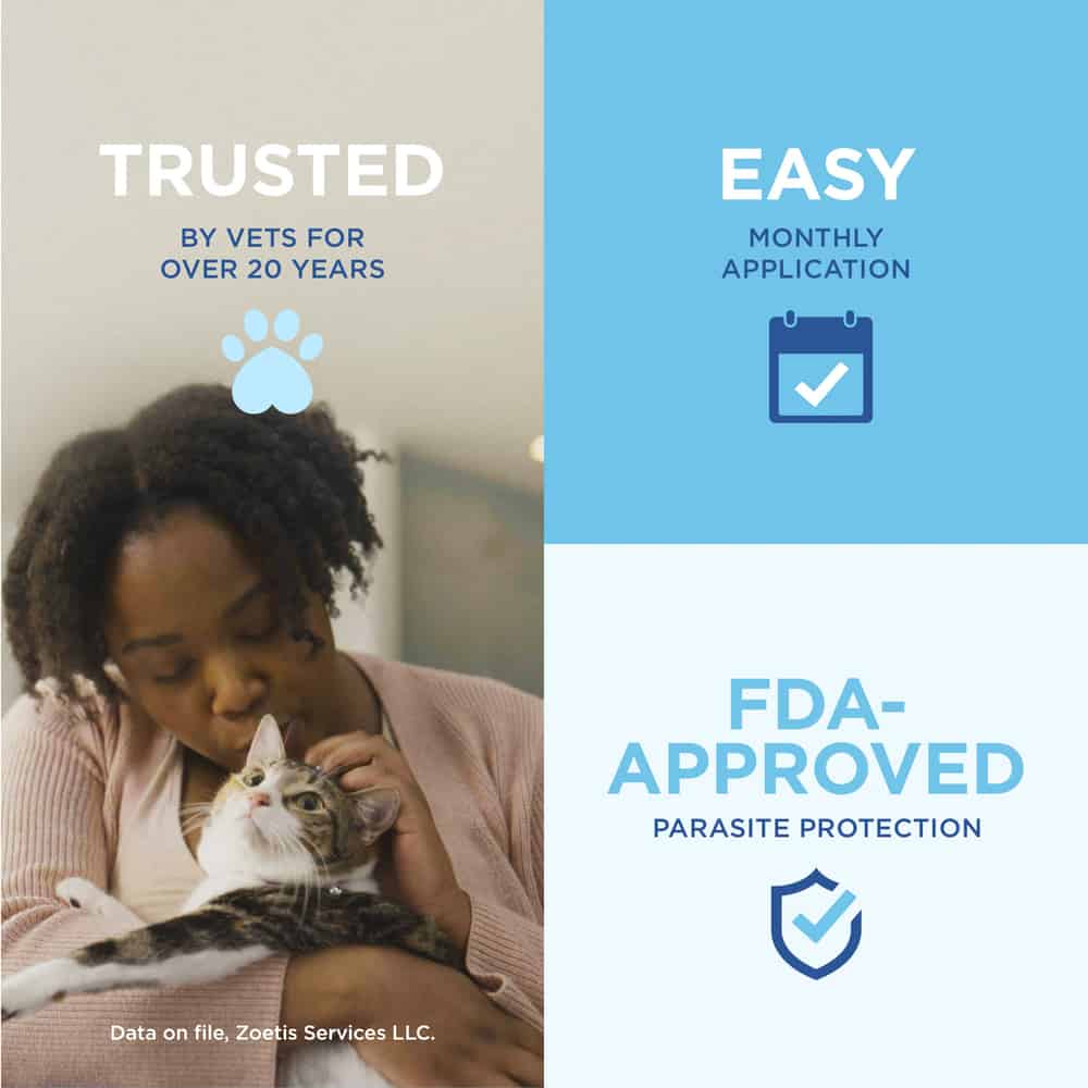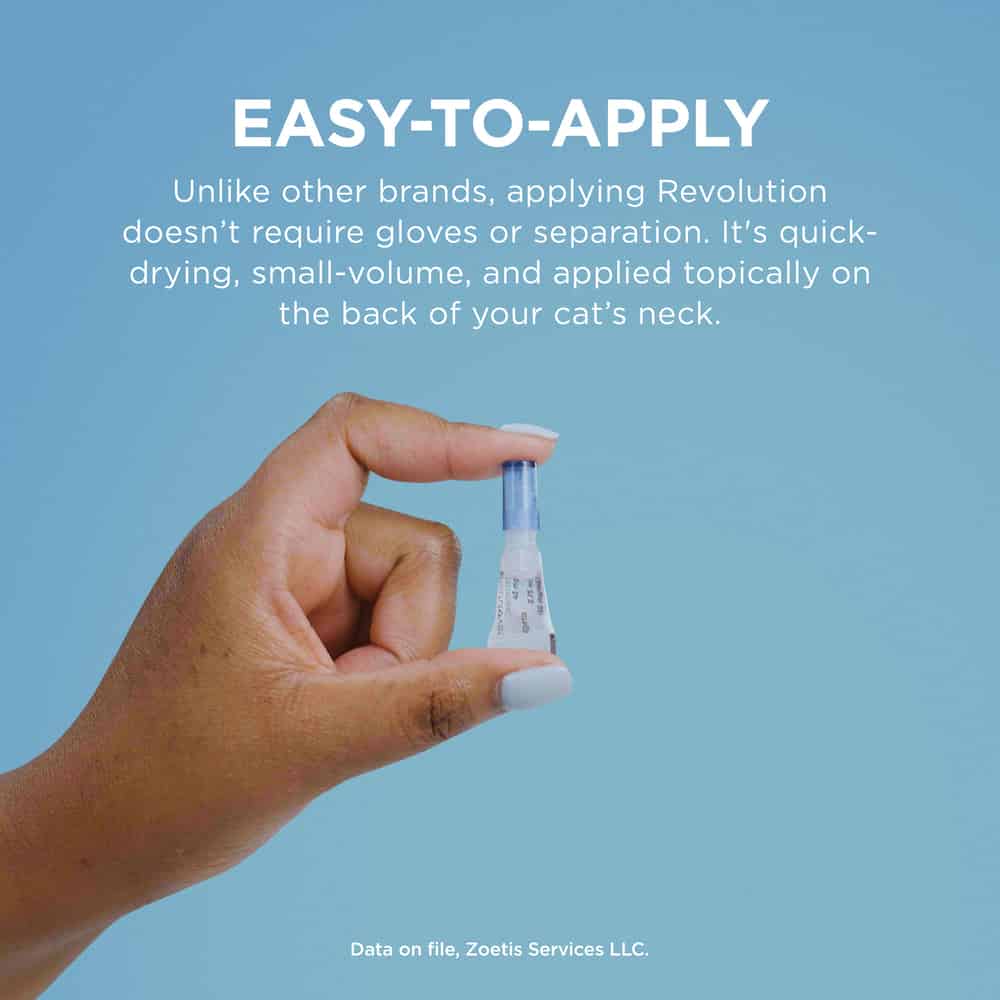 IMPORTANT SAFETY INFORMATION: Do not use REVOLUTION on sick, weak, or underweight animals. Use only on cats 8 weeks and older. In cats, side effects may include digestive upset and temporary hair loss at application site with possible inflammation. In people, REVOLUTION may be irritating to skin and eyes. Wash hands after use.