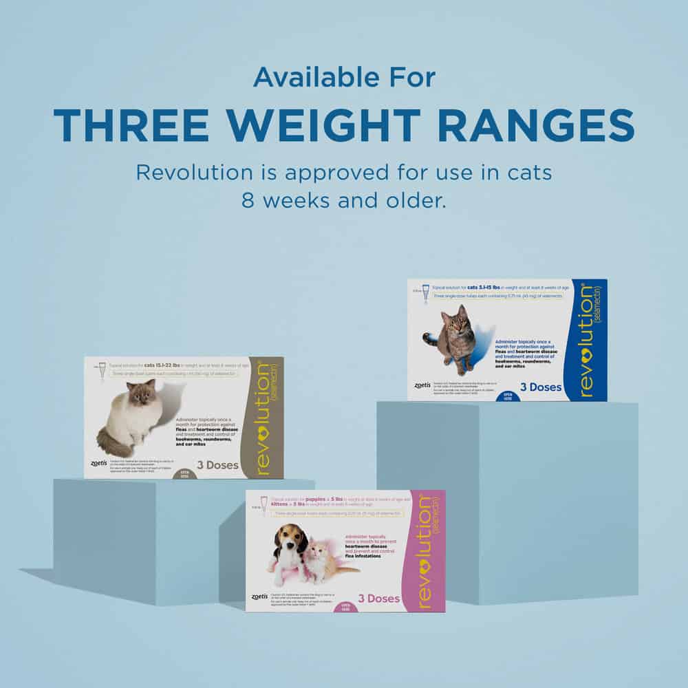 Apply Revolution® (Selamectin) exactly as directed by your veterinarian. If you do not understand the directions ask your pharmacist or veterinarian to explain them to you. Revolution® (Selamectin) is available as unit of use applicator tubes containing the specific amount of medication based on the weight of your pet. Revolution® (Selamectin) is available as a 15mg/0.25ml puppy/kitten dose for kittens older than 8 weeks weighing up to 5 lbs. Revolution® (Selamectin) is also available for cats 5.1-15 lbs (45mg/0.75ml), 15.1-22 lbs (60mg/1ml). The entire contents of the tube should be used. Do not split the contents as the accuracy of the dose and effectiveness of the medication cannot be assured. Bathing or shampooing your pet 2 or more hours after treatment will not reduce the effectiveness of Revolution® (Selamectin). Keep this medication away from children and pets.