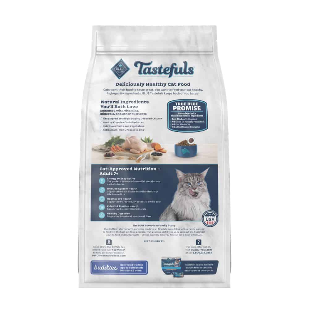 BLUE Tastefuls starts with delicious deboned chicken and features wholesome whole grains and vegetables to provide your older cat with the right balance of high-quality proteins and complex carbohydrates to help maintain an active life.
