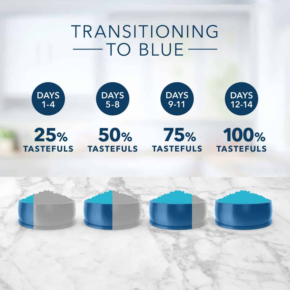 Transition Cat Food Gradually: Start by mixing 25% of BLUE with your cats's old food, and gradually increase the proportion of BLUE over the next 14 days.