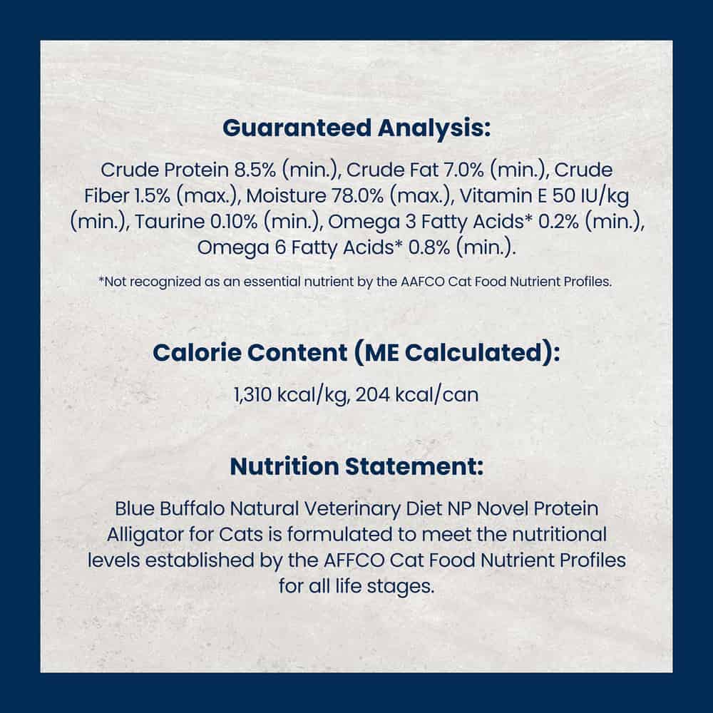 BLUE Natural Veterinary Diet NP Novel Protein-Alligator Wet Cat Food is formulated to nutritionally manage inflammatory skin and GI diseases in cats who experience adverse food reactions. Starting with alligator, a unique animal protein source, it’s the delicious, therapeutic way to help treat your cat’s adverse food reactions. BLUE Natural Veterinary Diet NP Novel Protein-Alligator Wet Cat Food needs authorization from your veterinarian.