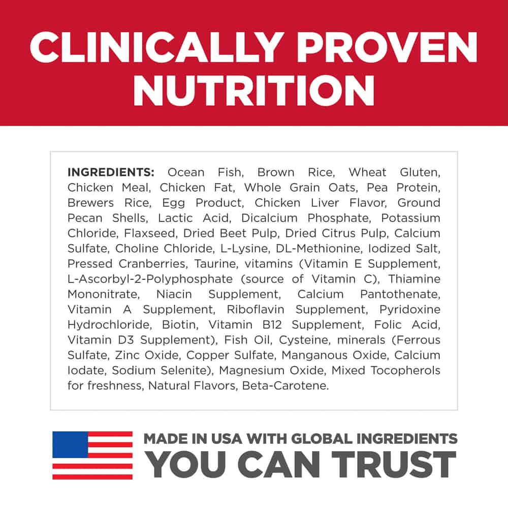 | Ocean Fish, Brown Rice, Wheat Gluten, Chicken Meal, Chicken Fat, Whole Grain Oats, Pea Protein, Brewers Rice, Egg Product, Chicken Liver Flavor, Ground Pecan Shells, Lactic Acid, Dicalcium Phosphate, Potassium Chloride, Flaxseed, Dried Beet Pulp, Dried Citrus Pulp, Calcium Sulfate, Choline Chloride, L-Lysine, DL-Methionine, Iodized Salt, Pressed Cranberries, Taurine, vitamins (Vitamin E Supplement, L-Ascorbyl-2-Polyphosphate (source of Vitamin C), Thiamine Mononitrate, Niacin Supplement, Calcium Pantothenate, Vitamin A Supplement, Riboflavin Supplement, Pyridoxine Hydrochloride, Biotin, Vitamin B12 Supplement, Folic Acid, Vitamin D3 Supplement), Fish Oil, Cysteine, minerals (Ferrous Sulfate, Zinc Oxide, Copper Sulfate, Manganous Oxide, Calcium Iodate, Sodium Selenite), Magnesium Oxide, Mixed Tocopherols for freshness, Natural Flavors, Beta-Carotene. |
