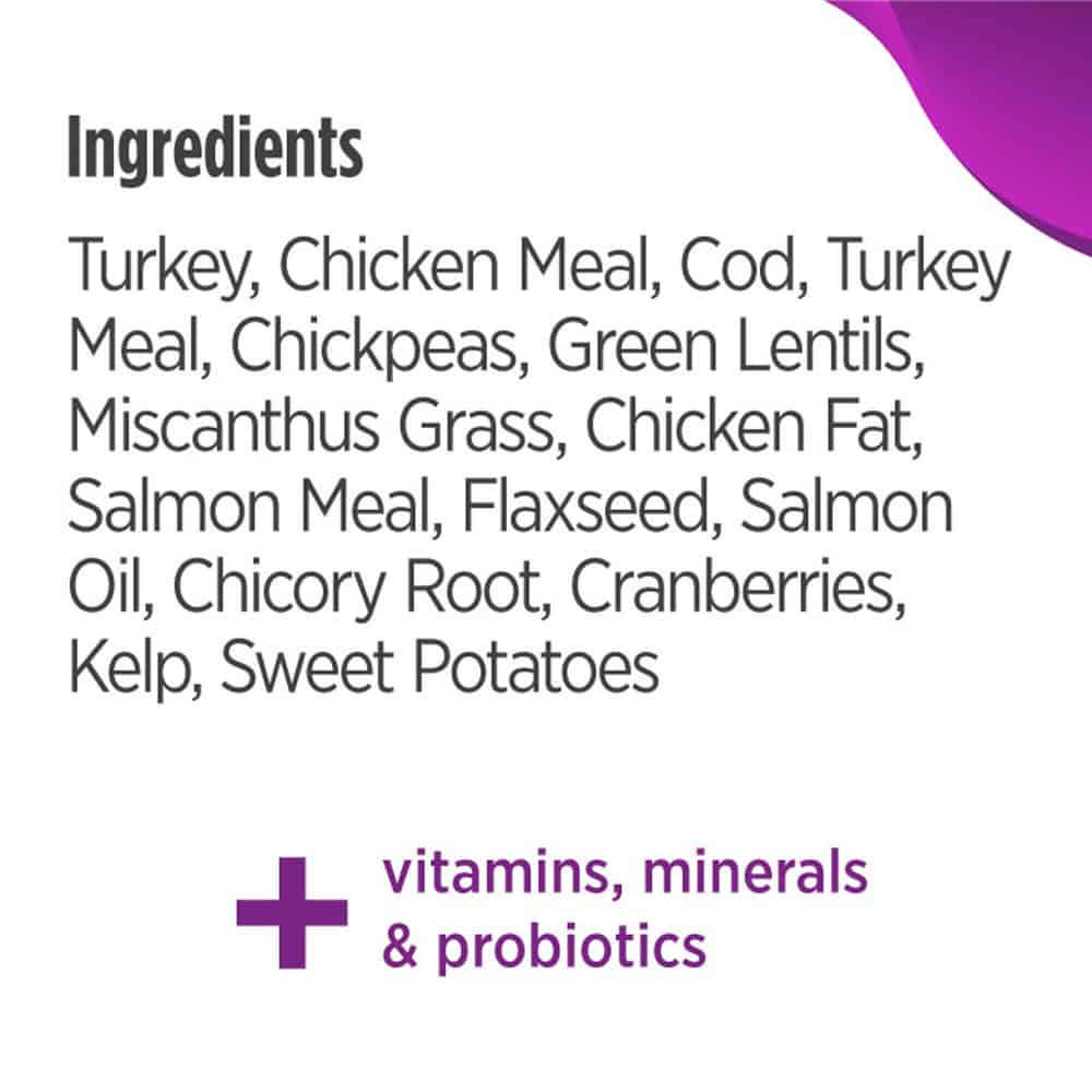 | Deboned Turkey, Chicken Meal, Deboned Cod, Turkey Meal, Chickpeas, Green Lentils, Ground Miscanthus Grass, Chicken Fat (preserved with Mixed Tocopherols & Citric Acid), Salmon Meal, Natural Flavor, Flaxseed, Salmon Oil, Choline Chloride, Dried Chicory Root, Calcium Carbonate, DL-Methionine, Dried Cranberries, Dried Kelp, Dried Sweet Potatoes, Vitamin E Supplement, Yucca Schidigera Extract, L-Carnitine, Taurine, Zinc Proteinate, Niacin Supplement, Zinc Sulfate, Iron Proteinate, L-Ascorbyl-2-Polyphosphate (source of Vitamin C), Ferrous Sulfate, Vitamin A Supplement, Thiamine Mononitrate, Calcium Pantothenate, Copper Proteinate, Copper Sulfate, Manganese Proteinate, Riboflavin Supplement, Pyridoxine Hydrochloride, Biotin, Dried Bacillus coagulans Fermentation Product, Vitamin B12 Supplement, Manganous Oxide, Vitamin D3 Supplement, Folic Acid, Sodium Selenite, Calcium Iodate, Rosemary Extract. |