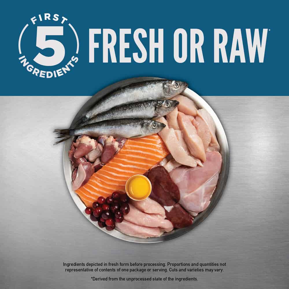 - First five ingredients are fresh or raw, including chicken, wild-caught salmon and rabbit, and responsibly farmed pollock oil offers increased levels of Omega 3s, EPA and DHA
