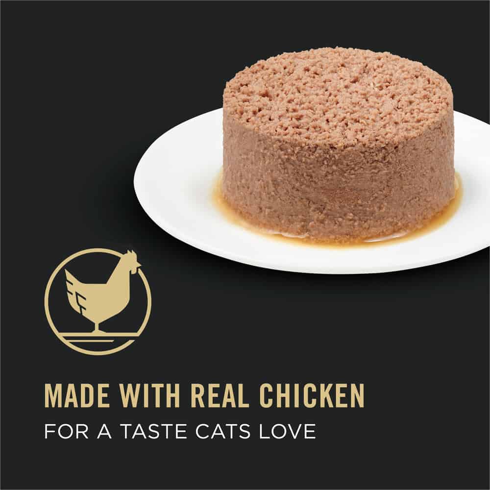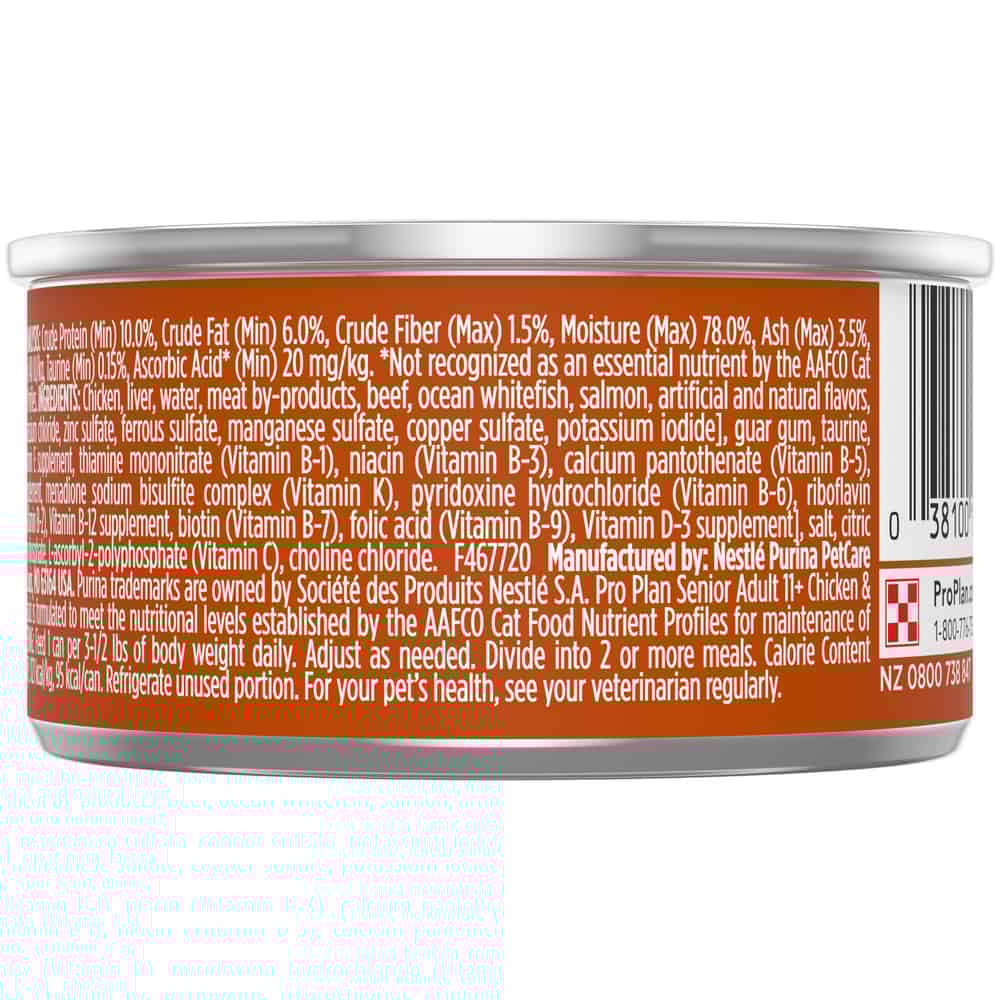 Give your older cat the specialized nutrition they need to thrive with Purina Pro Plan Senior 11+ Chicken and Beef Entree adult wet cat food. This senior cat food provides extra-care nutrition specially formulated to meet the needs of cats age 11+. The highly digestible soft cat food pate allows for optimal nutrient delivery and is made with real chicken and beef for a taste cats love. Watch sink teeth into the moist tender texture of this real chicken and beef cat food, and feel good knowing they're getting a complete and balanced meal made especially for adult cats. Purina proudly manufactures this pate wet cat food in Purina-owned, U.S. facilities, so you can feel good about the meals you put in dish.