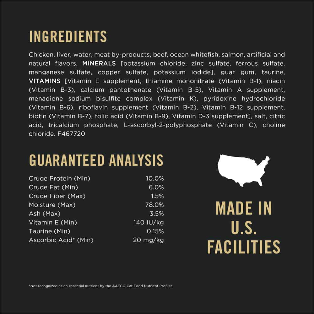 Chicken, Liver, Water, Meat By-Products, Beef, Ocean Whitefish, Salmon, Artificial And Natural Flavors, MINERALS [Potassium Chloride, Zinc Sulfate, Ferrous Sulfate, Manganese Sulfate, Copper Sulfate, Potassium Iodide], Guar Gum, Taurine, VITAMINS [Vitamin E Supplement, Thiamine Mononitrate (Vitamin B-1), Niacin (Vitamin B-3), Calcium Pantothenate (Vitamin B-5), Vitamin A Supplement, Menadione Sodium Bisulfite Complex (Vitamin K), Pyridoxine Hydrochloride (Vitamin B-6), Riboflavin Supplement (Vitamin B-2), Vitamin B-12 Supplement, Biotin (Vitamin B-7), Folic Acid (Vitamin B-9), Vitamin D-3 Supplement], Salt, Citric Acid, Tricalcium Phosphate, L-Ascorbyl-2-Polyphosphate (Vitamin C), Choline Chloride. F467720