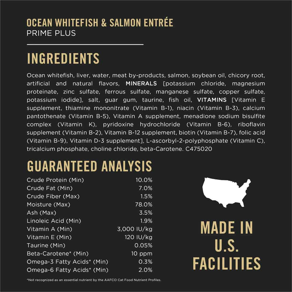 | Ocean Whitefish, Liver, Water, Meat By-Products, Salmon, Soybean Oil, Chicory Root, Artificial And Natural Flavors, MINERALS [Potassium Chloride, Magnesium Proteinate, Zinc Sulfate, Ferrous Sulfate, Manganese Sulfate, Copper Sulfate, Potassium Iodide], Salt, Guar Gum, Taurine, Fish Oil, VITAMINS [Vitamin E Supplement, Thiamine Mononitrate (Vitamin B-1), Niacin (Vitamin B-3), Calcium Pantothenate (Vitamin B-5), Vitamin A Supplement, Menadione Sodium Bisulfite Complex (Vitamin K), Pyridoxine Hydrochloride (Vitamin B-6), Riboflavin Supplement (Vitamin B-2), Vitamin B-12 Supplement, Biotin (Vitamin B-7), Folic Acid (Vitamin B-9), Vitamin D-3 Supplement], L-Ascorbyl-2-Polyphosphate (Vitamin C), Tricalcium Phosphate, Choline Chloride, Beta-Carotene. C475020 |