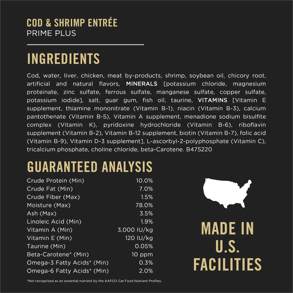 | Cod, Water, Liver, Chicken, Meat By-Products, Shrimp, Soybean Oil, Chicory Root, Artificial And Natural Flavors, MINERALS [Potassium Chloride, Magnesium Proteinate, Zinc Sulfate, Ferrous Sulfate, Manganese Sulfate, Copper Sulfate, Potassium Iodide], Salt, Guar Gum, Fish Oil, Taurine, VITAMINS [Vitamin E Supplement, Thiamine Mononitrate (Vitamin B-1), Niacin (Vitamin B-3), Calcium Pantothenate (Vitamin B-5), Vitamin A Supplement, Menadione Sodium Bisulfite Complex (Vitamin K), Pyridoxine Hydrochloride (Vitamin B-6), Riboflavin Supplement (Vitamin B-2), Vitamin B-12 Supplement, Biotin (Vitamin B-7), Folic Acid (Vitamin B-9), Vitamin D-3 Supplement], L-Ascorbyl-2-Polyphosphate (Vitamin C), Tricalcium Phosphate, Choline Chloride, Beta-Carotene. B475220 |
