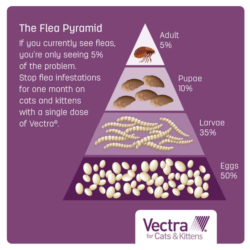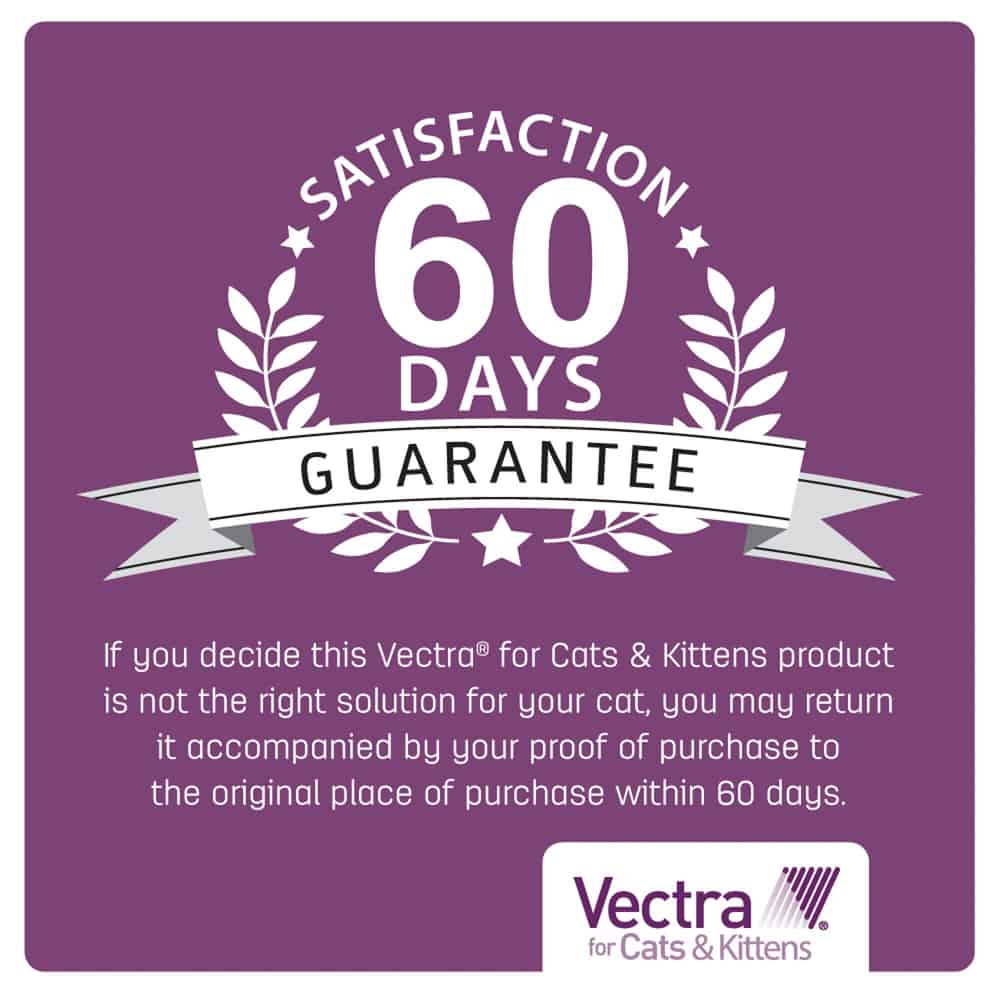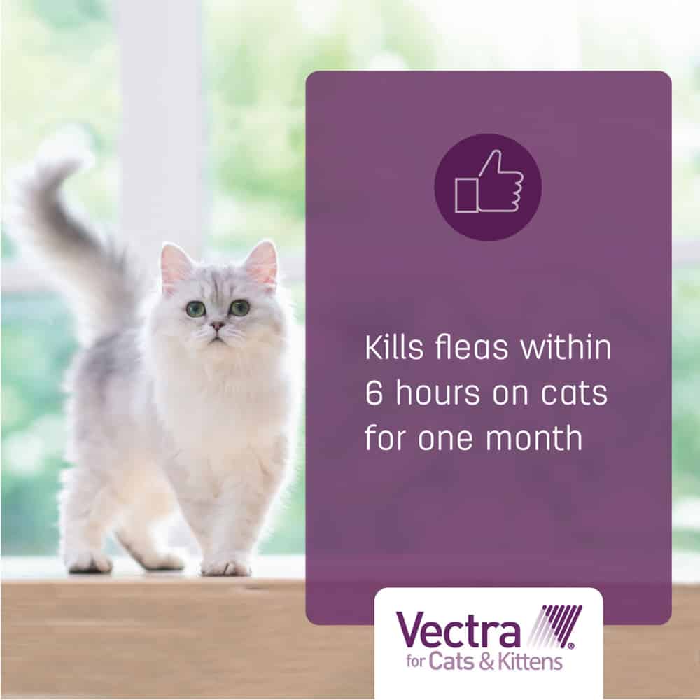 Vectra for Cats is an effective, topical solution for cats and kittens over 8 weeks of age, providing control of adult fleas, flea eggs, and flea larvae and pupae. It kills fleas within 6 hours of application and protects your cat or kitten from all stages of fleas for one month. This topical solution is quick drying, non-greasy and comes in an easy-to-use applicator. Vectra for Cats kills fleas that may transmit diseases, including bartonellosis, tapeworm, and tularemia. It also kills fleas that may cause flea allergy dermatitis and anemia.