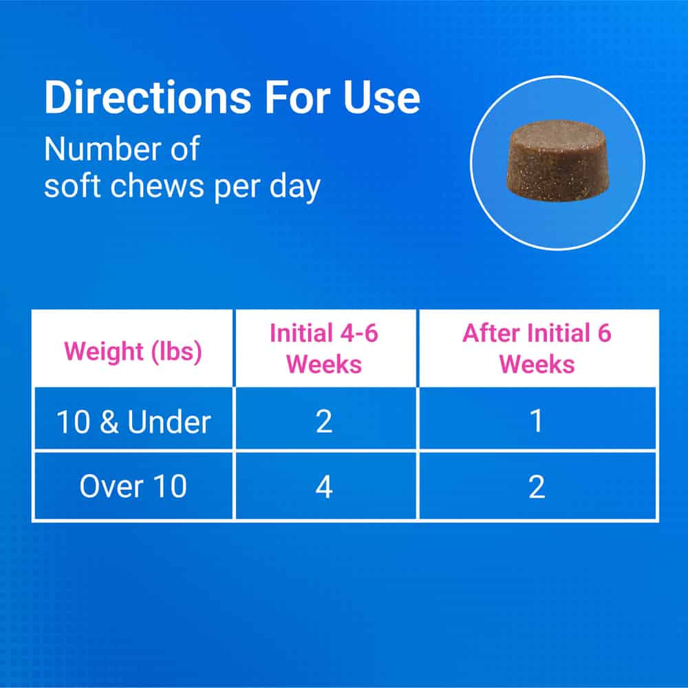 | Under 10 lbs | 2 soft chews daily |