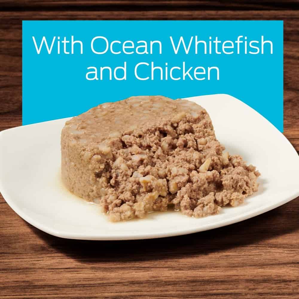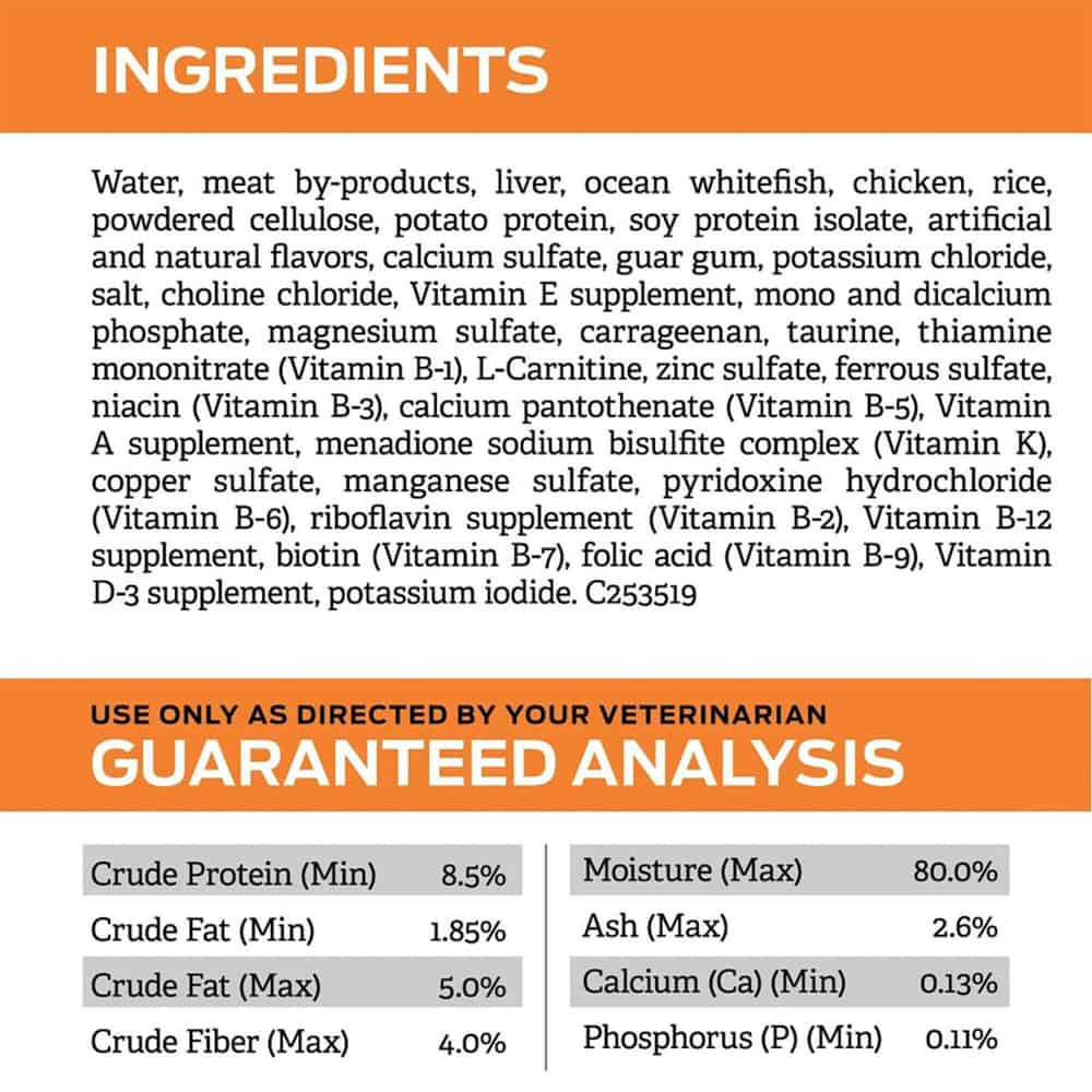 | Water, Meat By-products, Liver, Ocean Whitefish, Chicken, Rice, Powdered Cellulose, Potato Protein, Soy Protein Isolate, Artificial And Natural Flavors, Calcium Sulfate, Guar Gum, Potassium Chloride, Salt, Choline Chloride, Vitamin E Supplement, Mono And Dicalcium Phosphate, Magnesium Sulfate, Carrageenan, Taurine, Thiamine Mononitrate (Vitamin B-1), L-carnitine, Zinc Sulfate, Ferrous Sulfate, Niacin (Vitamin B-3), Calcium Pantothenate (Vitamin B-5), Vitamin A Supplement, Menadione Sodium Bisulfite Complex (Vitamin K), Copper Sulfate, Manganese Sulfate, Pyridoxine Hydrochloride (Vitamin B-6), Riboflavin Supplement (Vitamin B-2), Vitamin B-12 Supplement, Biotin (Vitamin B-7), Folic Acid (Vitamin B-9), Vitamin D-3 Supplement, Potassium Iodide. C253519 |