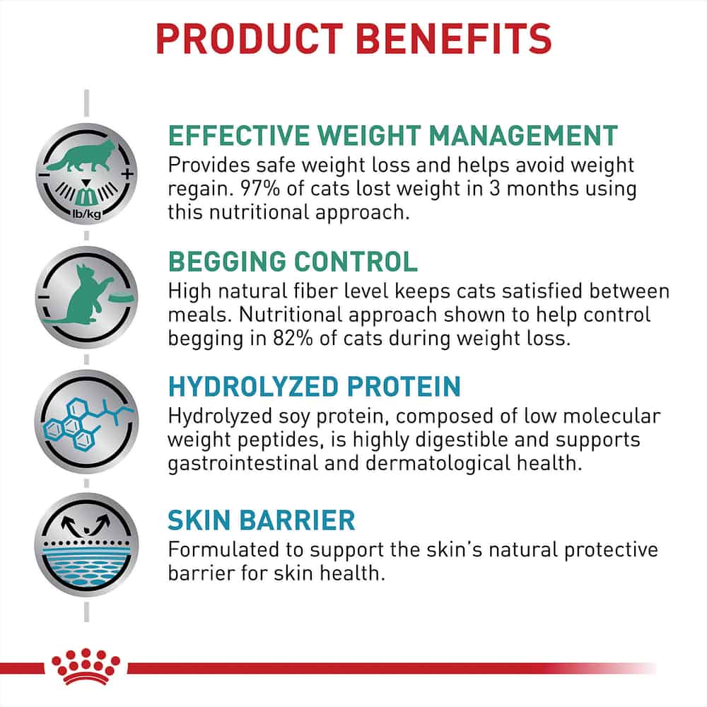 The high fiber content creates a satiety effect, physically filling the stomach to trigger 'fullness' signals to the brain. Hydrolyzed proteins are utilized to provide essential nutrition while bypassing the immune system's allergic response mechanisms. Finally, the formula is designed to create a urinary environment that is unfavorable for the development of struvite and calcium oxalate crystals, which are common concerns in overweight cats.