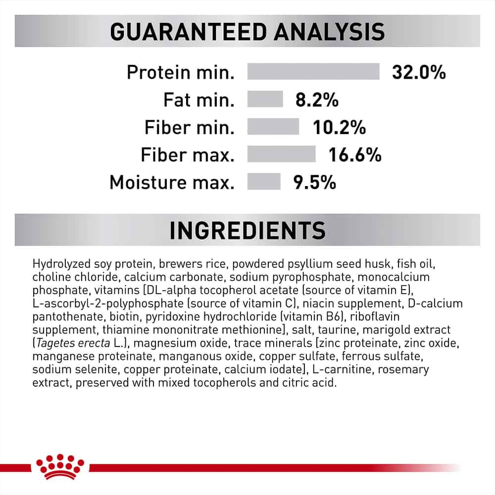| Hydrolyzed Soy Protein, Brewers Rice, Powdered Cellulose, Chicken Fat, Natural Flavors, Dried Chicory Root, Calcium Sulfate, Potassium Chloride, Powdered Psyllium Seed Husk, Fish Oil, Choline Chloride, Calcium Carbonate, Sodium Pyrophosphate, Monocalcium Phosphate, Vitamins[DL-Alpha Tocopherol Acetate (Source Of Vitamin E), L-Ascorbyl-2-Polyphosphate (Source Of Vitamin C), Niacin Supplement, D-Calcium Pantothenate, Biotin, Pyridoxine Hydrochloride (Vitamin B6), Riboflavin Supplement, Thiamine Mononitrate (Vitamin B1), Vitamin A Acetate, Vitamin B12 Supplement, Folic Acid, Vitamin D3 Supplement], DL-Methionine, Salt, Taurine, Marigold Extract (Tagetes Erecta L.), Magnesium Oxide, Trace Minerals[Zinc Proteinate, Zinc Oxide, Manganese Proteinate, Manganous Oxide, Copper Sulfate, Ferrous Sulfate, Sodium Selenite, Copper Proteinate, Calcium Iodate], L-Carnitine, Rosemary Extract, Preserved With Mixed Tocopherols And Citric Acid. |