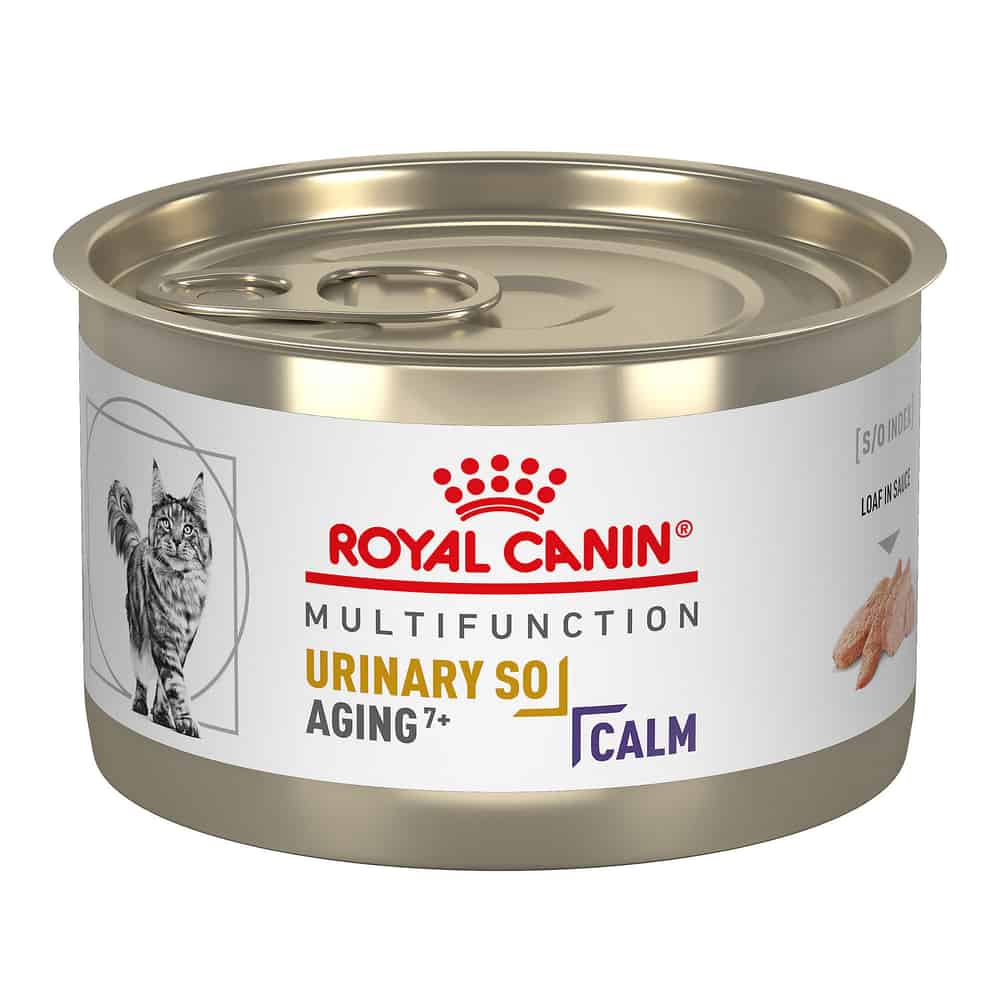 What is Royal Canin Veterinary Diet Feline Multifunction Urinary SO Aging 7+ and Calm Loaf in Sauce Canned Wet Cat Food?