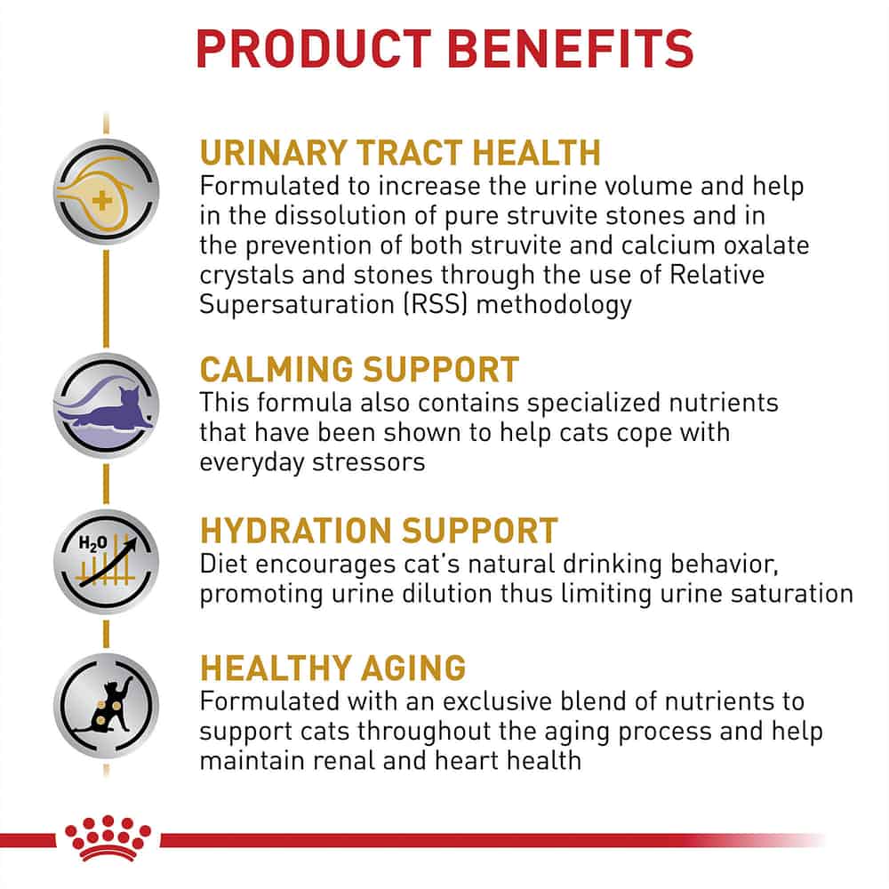 How does Royal Canin Veterinary Diet Feline Multifunction Urinary SO Aging 7+ and Calm Loaf in Sauce Canned Wet Cat Food work?