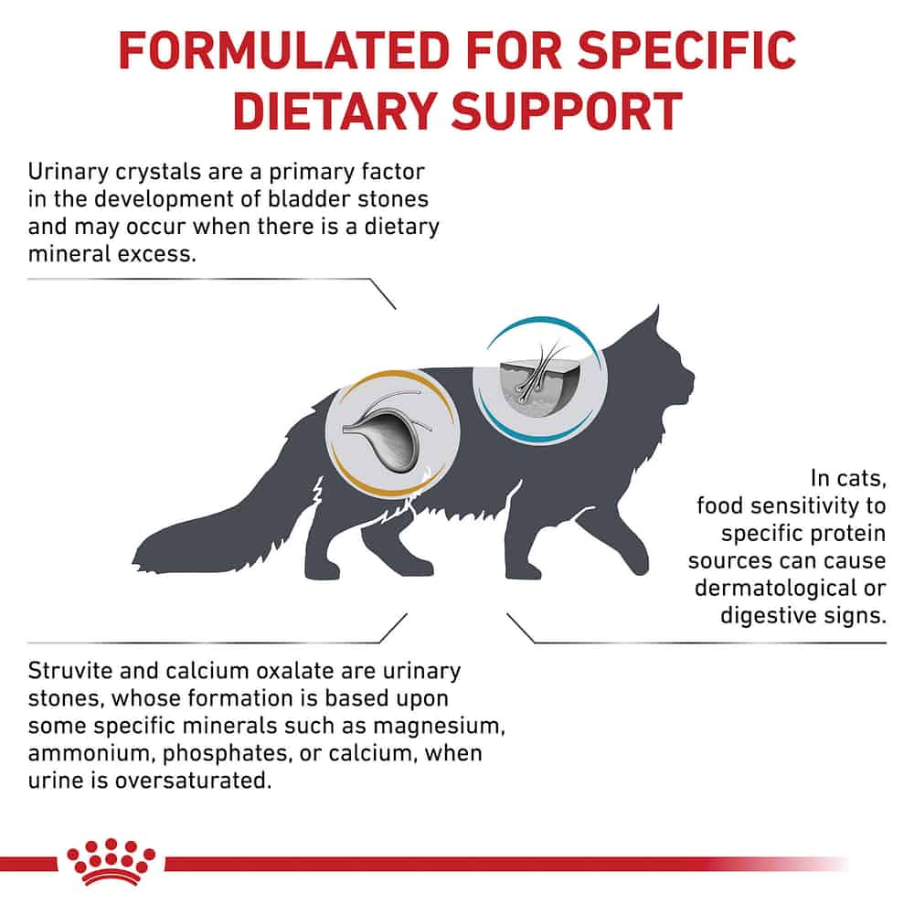 This diet provides comprehensive support for cats requiring urinary tract management and a hypoallergenic protein source. It is designed to dissolve pure struvite stones and reduce the risk of both struvite and calcium oxalate crystal formation. The hydrolyzed protein source helps manage cats that have concurrent gastrointestinal or dermatological issues caused by food sensitivities. This multifunction approach simplifies the feeding process for owners of cats with multiple medical requirements.