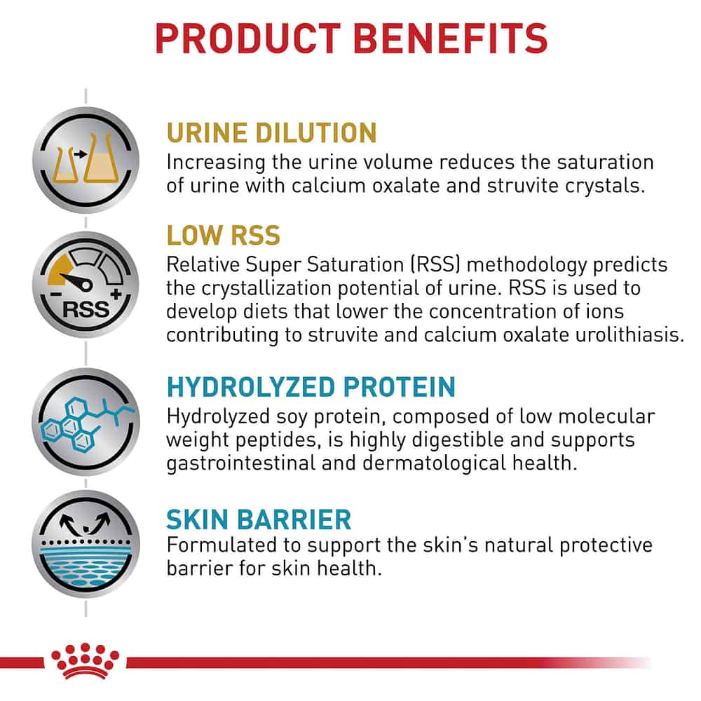 The formula uses Relative SuperSaturation (RSS) technology to ensure urine is diluted enough to prevent mineral crystallization. Hydrolyzed soy protein, consisting of low-molecular-weight peptides, ensures high digestibility and a low risk of an allergic immune response. Additionally, essential fatty acids and antioxidants are included to support the skin's natural barrier and overall immune health.