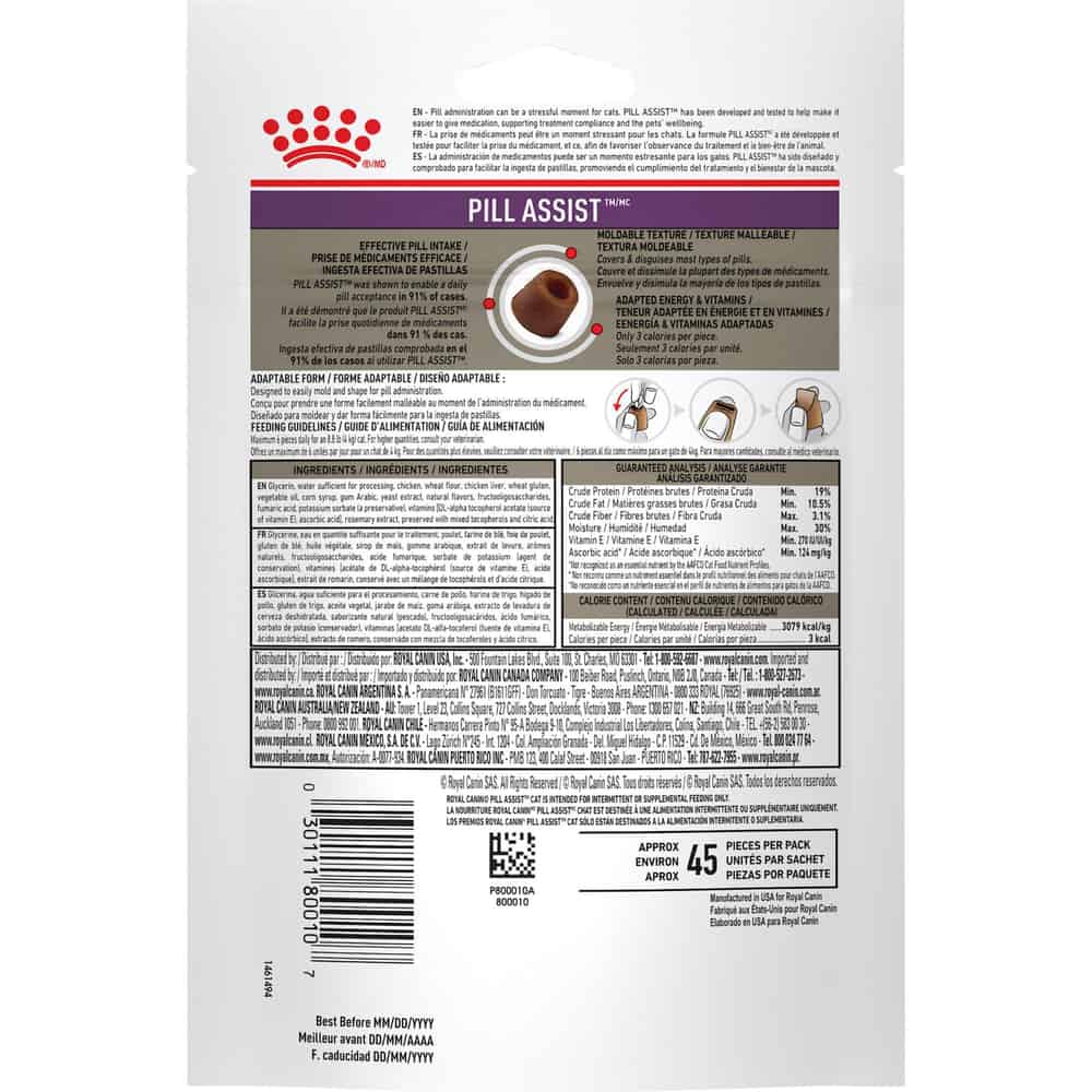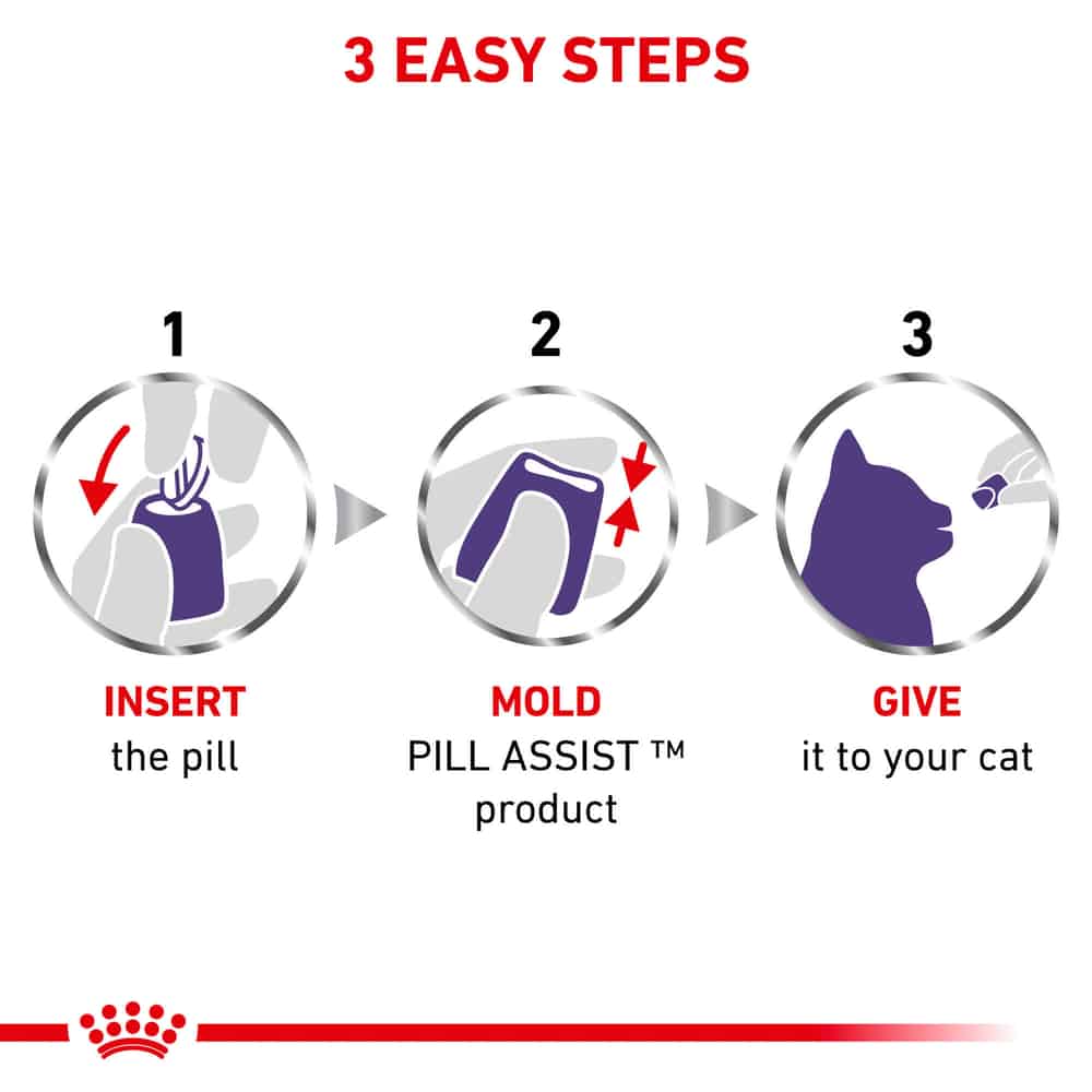 Royal Canin Pill Assist oral medication pouches are designed to hide pills so it’s easy to give your cat medication. The soft texture pill pouches are completely moldable to conceal capsules and tablets.