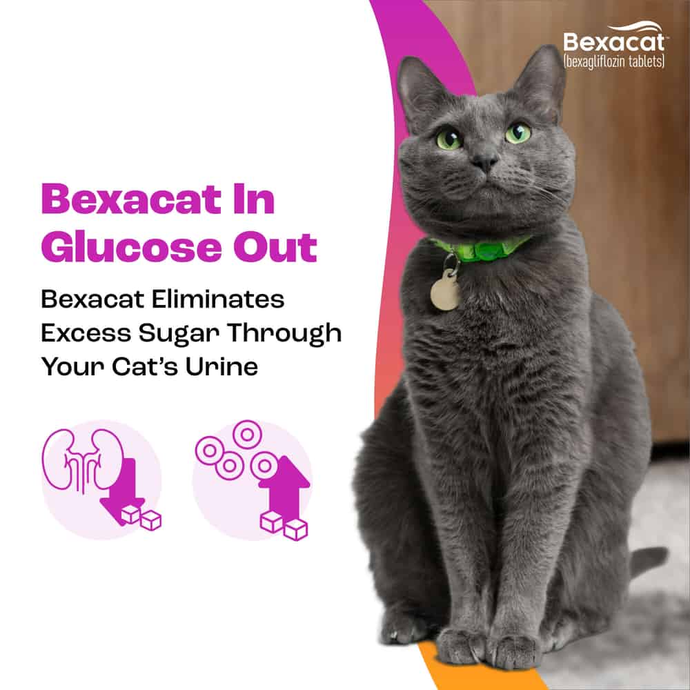 - Controls blood sugar: Bexacat eliminates excess sugar through your cat's urine by inhibiting reabsorption
