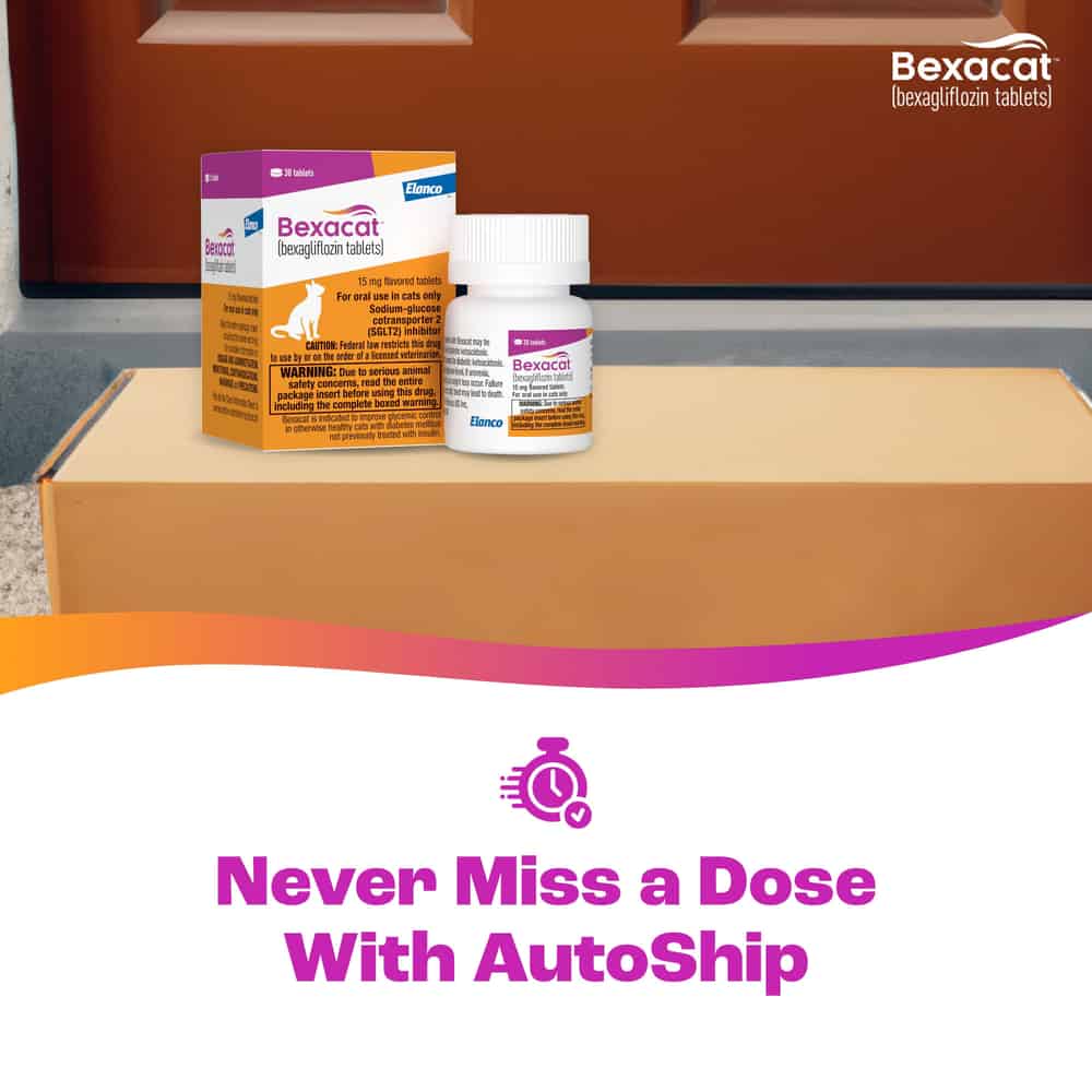 Serious side effects have occurred, with or without warning, and have sometimes led to death in cats treated with Bexacat. Serious side effects may require your cat to be hospitalized and to be given specific treatments, including insulin. The most common side effects include vomiting, diarrhea, less interest in food or not eating, lack of energy, and dehydration. Regular check-ups by your veterinarian are needed to monitor for side effects and to tell if your cat’s blood sugar is responding to Bexacat as expected.