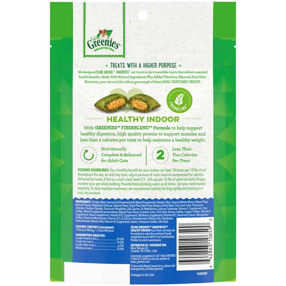 Feline Greenies Smartbites Healthy Indoor Treats for Cats are the perfect treat to keep your cat purring all day long. Created with GREENIES FIBERBLEND Formula, these treats help support healthy digestion, have high quality protein to support muscles, and at less than 2 calories per treat help your cat maintain a healthy weight.