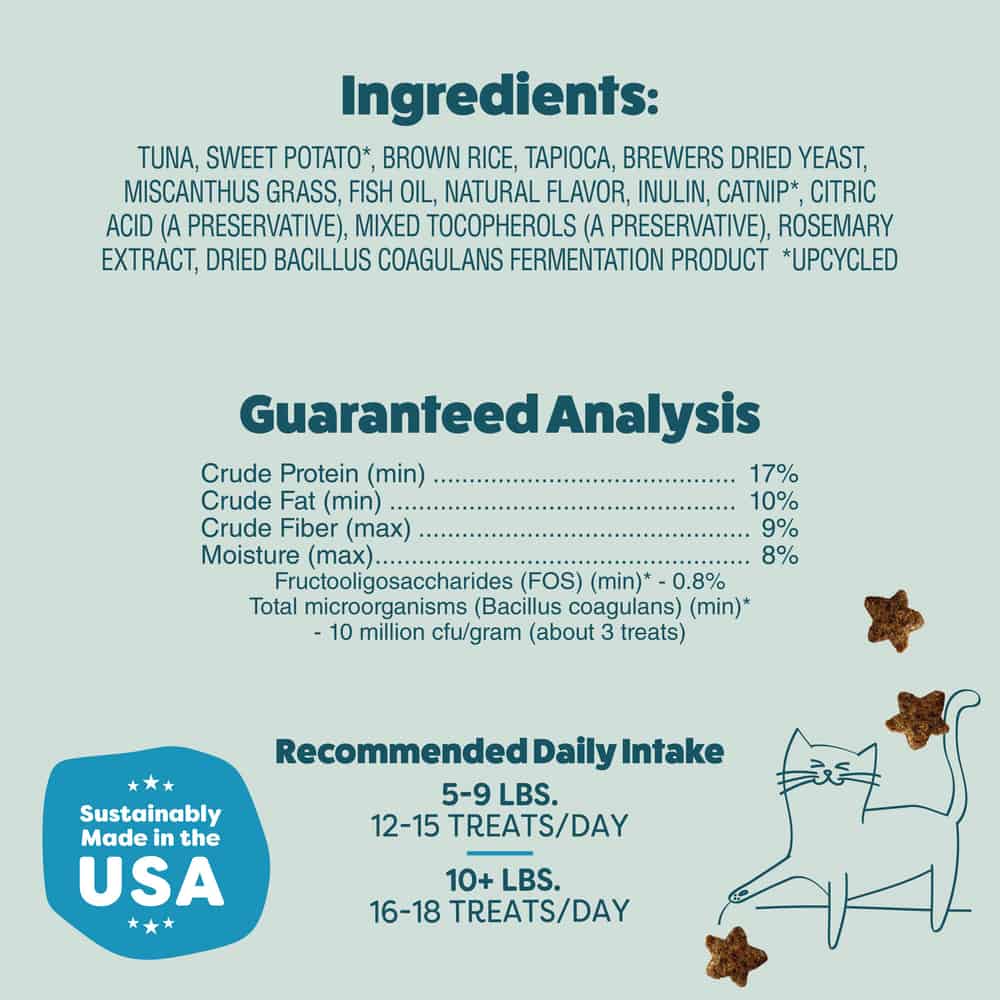 | Tuna, Sweet Potato*, Brown Rice, Tapioca, Brewers Dried Yeast, Miscanthus Grass, Fish Oil, Natural Flavor, Inulin, Catnip*, Citric Acid (A Preservative), Mixed Tocopherols (A Preservative), Rosemary Extract, Dried Bacillus Coagulans Fermentation Product |