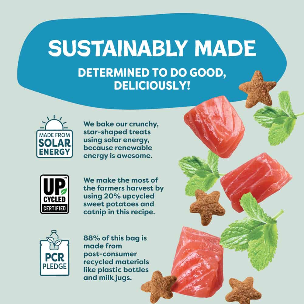 These crunchy, star-shaped, bite-sized treats are made with tuna, and upcycled sweet potatoes, so your cat's getting a more sustainable treat. Paired with catnip along with both pre & probiotics, these treats also help support digestion!