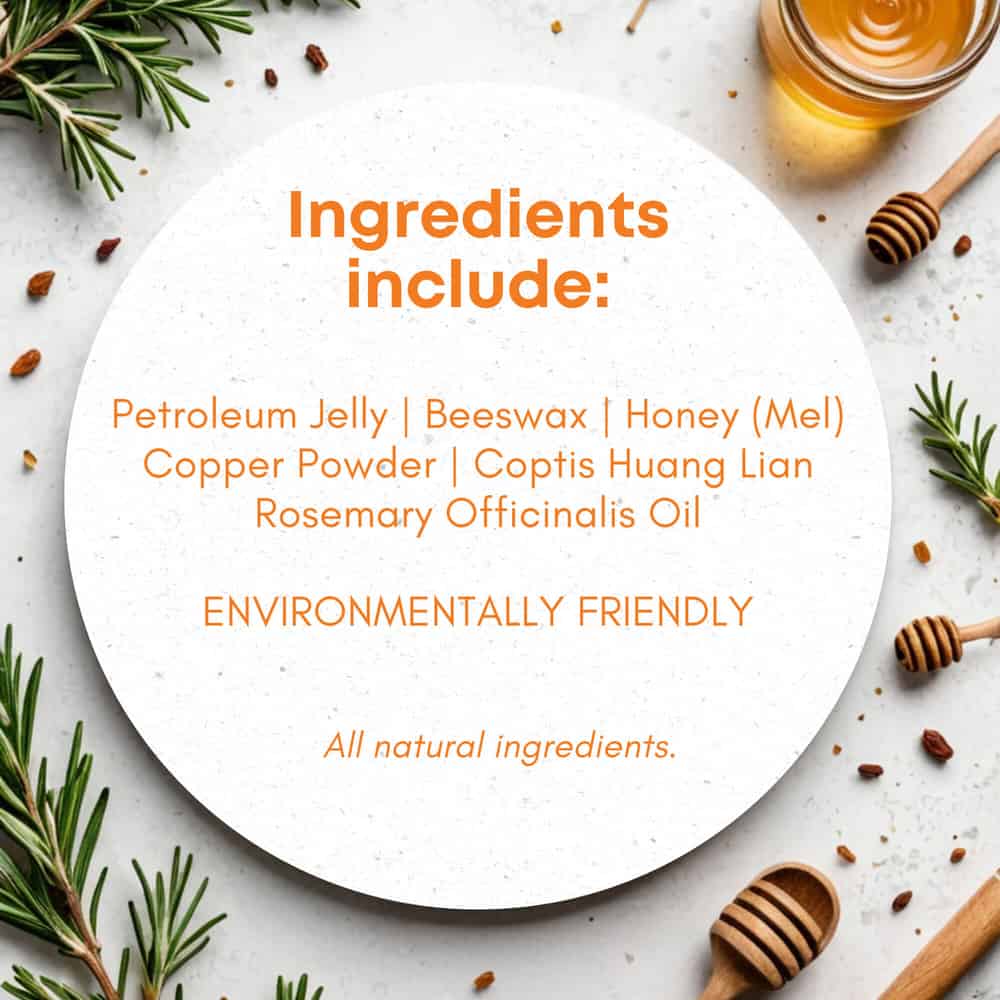 | Petroleum Jelly, Beeswax, Honey (Mel), Copper Powder, Coptis Huang Lian, Rosemary Officinalis Oil. |