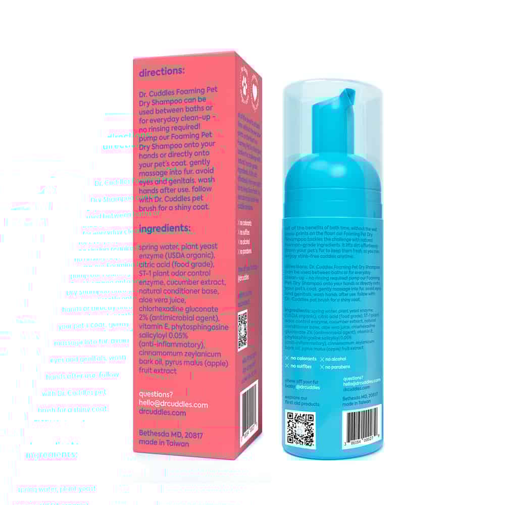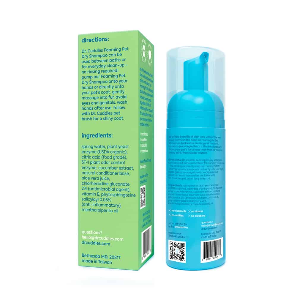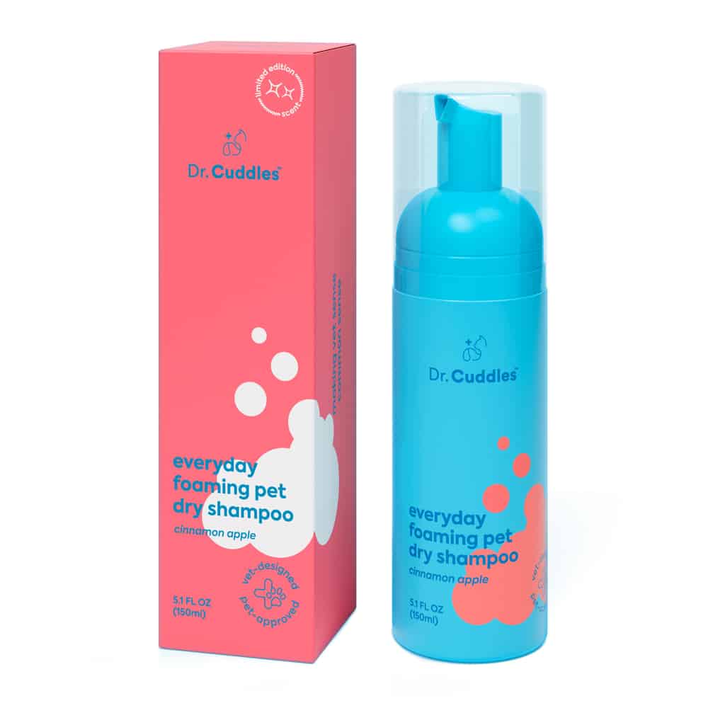 Hate bath time? Dr. Cuddles has you covered! All of the benefits of bath time, without the wet pawprints on the floor. The Dr. Cuddles Seasonal Foaming Dry Shampoo human-grade formula features natural botanicals, Fall and Winter Scent Nots, and deodorants & protein extract ingredients that actively soak up oil and dirt from fur to skin.