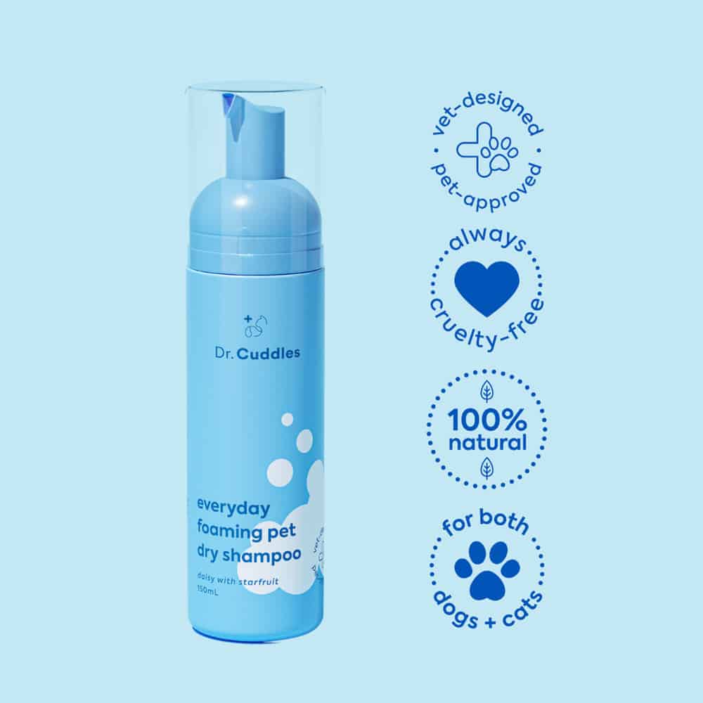 Hate bath time? Dr. Cuddles has you covered! All of the benefits of bath time, without the wet pawprints on the floor. The Dr. Cuddles Seasonal Foaming Dry Shampoo human-grade formula features natural botanicals, Fall and Winter Scent Nots, and deodorants & protein extract ingredients that actively soak up oil and dirt from fur to skin.