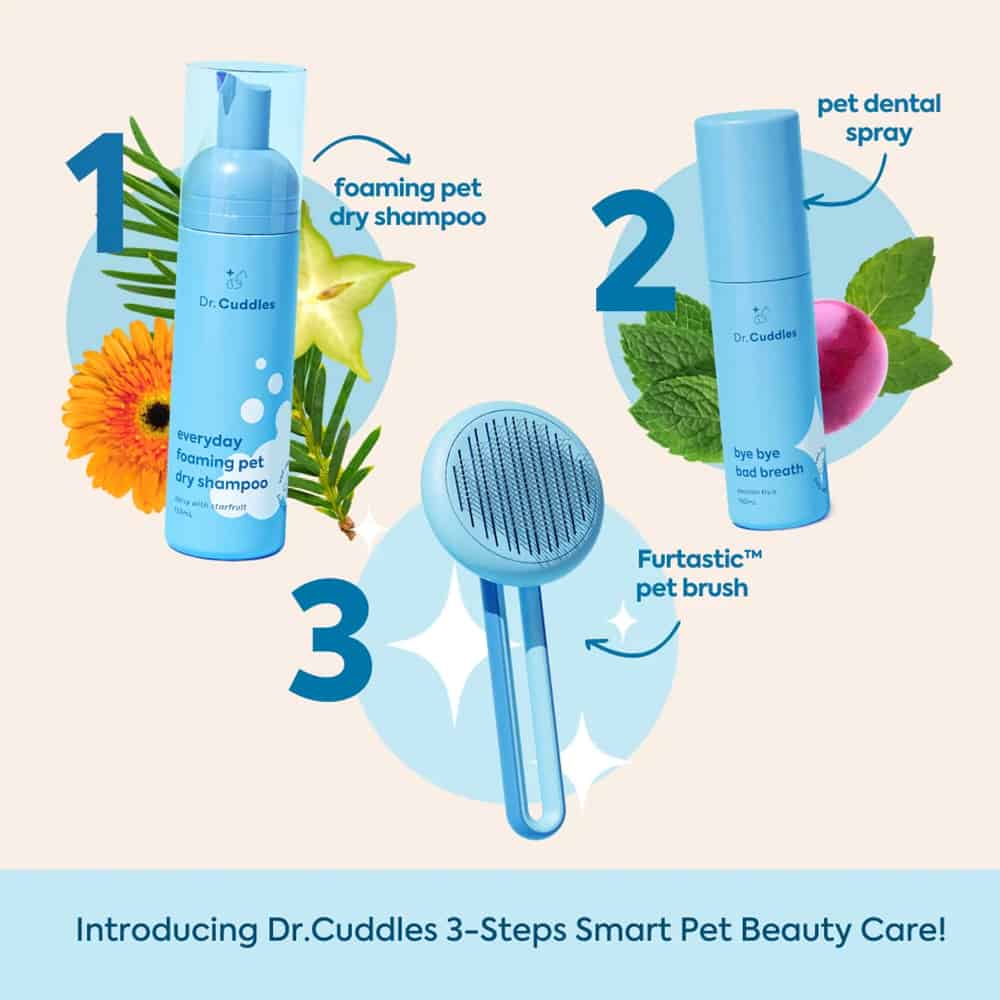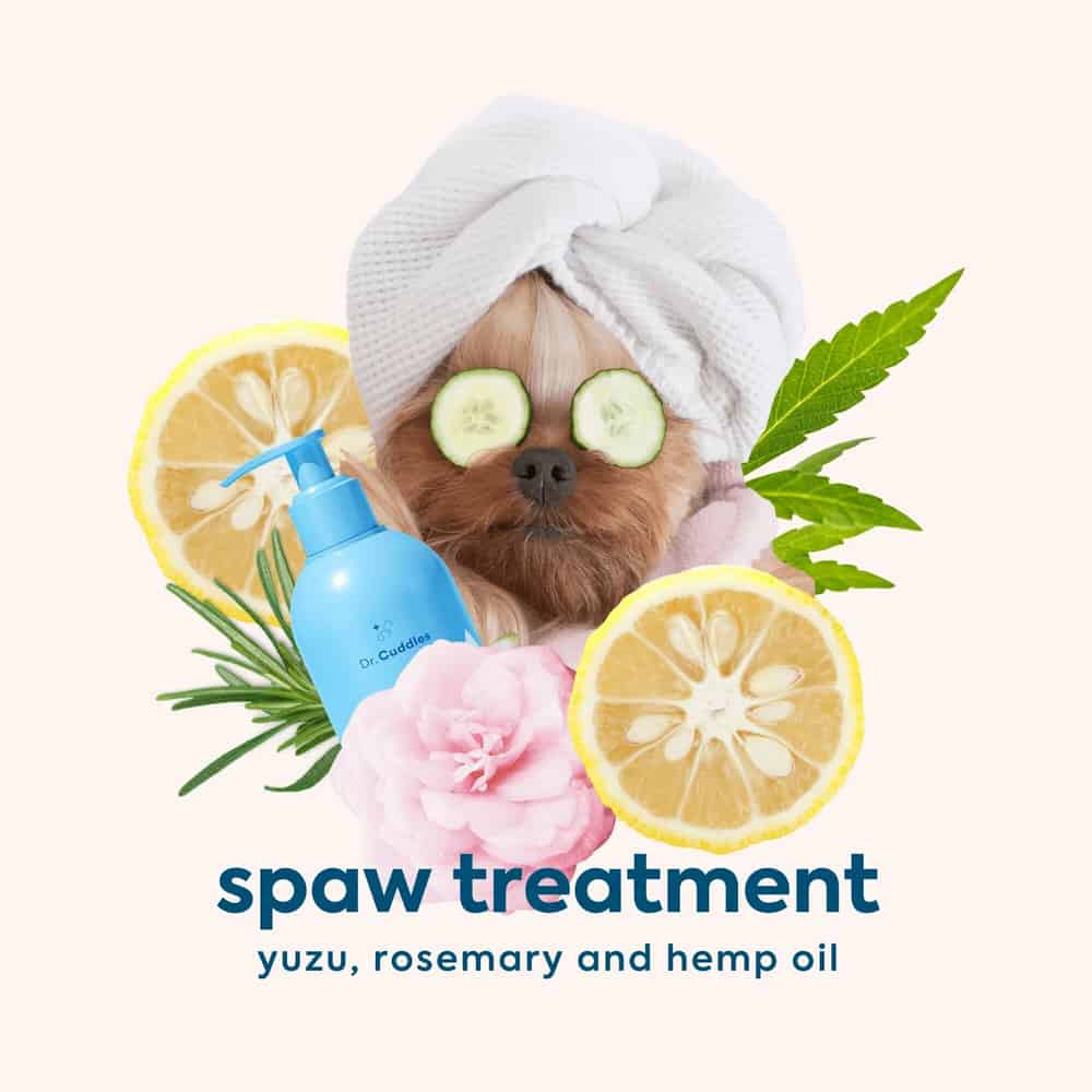 Dr. Cuddles Pawfect Gloss™ bubble pet shampoo created using their signature pH balanced formula features camellia flower oil to condition the fur, while shea butter, aloe vera and vitamin E to nourish sensitive skin. The soothing hemp oil and yuzu scent delicately mix to help reduce bathtime anxiety, helping your pet feel safe and relaxed during each wash.