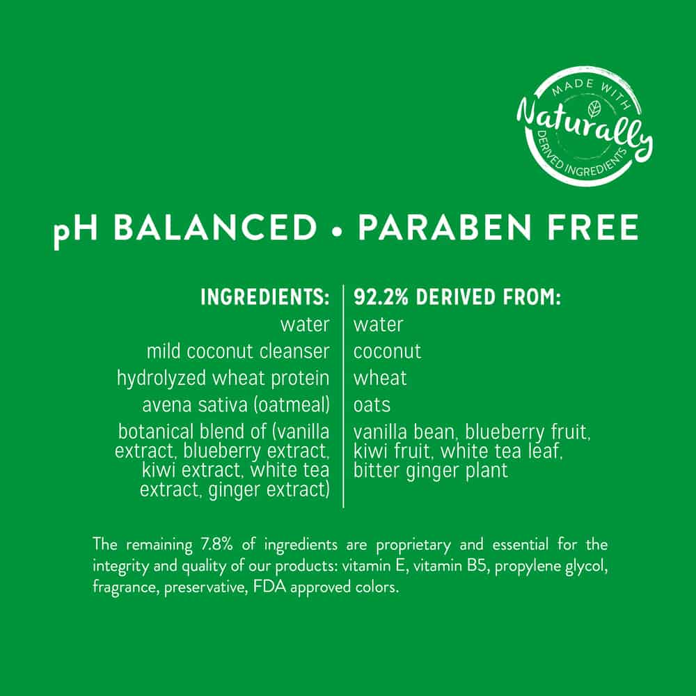 | Other Ingredients:Water, (Aqua) Mild Cleanser, Vanilla Planifolia, (Vanilla) Vaccinium Angustifolium, (Blueberry) Actinidia Chinesis (Kiwi), Vitamin E, Avena Sativa, (Oatmeal) Camelia Sinensis (White Tea) Zingiber Officinale (Ginger) |