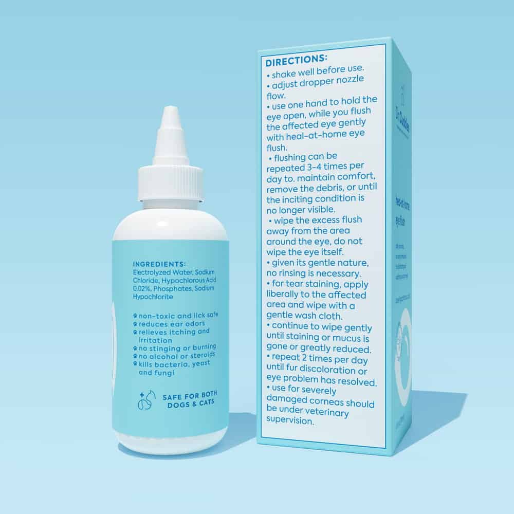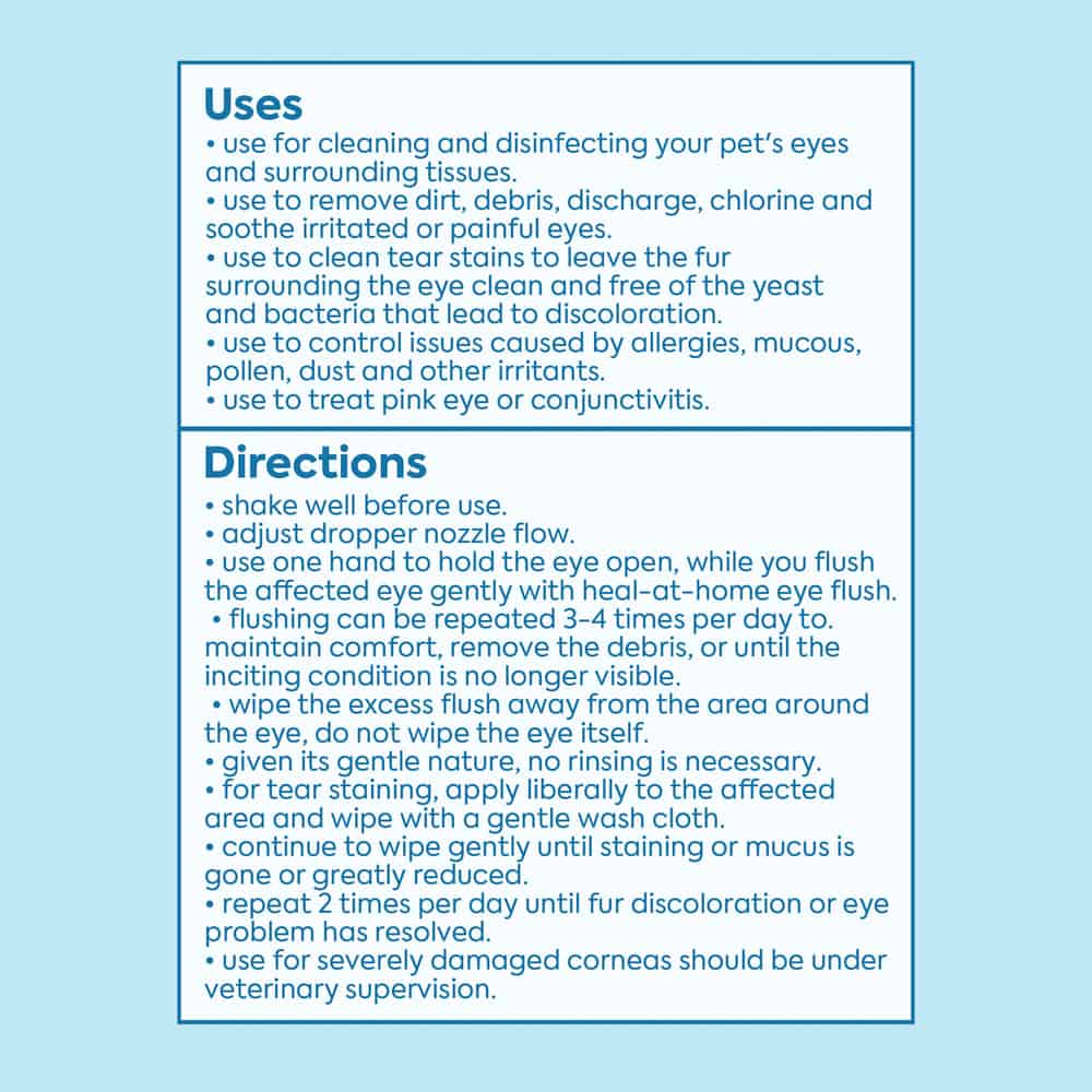 • DIRECTIONS: Shake well before use. Adjust dropper nozzle flow. Use one hand to hold the eye open, while you flush the affected eye gently with heal at home eye flush. Flushing can be repeated 3-4 times per day to maintain comfort, remove the debris, or until the inciting condition is no longer visible. Wipe the excess flush away from the area around the eye, do not wipe the eye itself. Given its gentle nature, no rinsing is necessary.