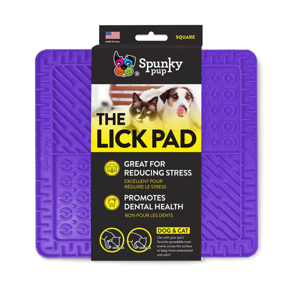The Lick Pad from Spunky Pup will keep your Dog or Cat entertained and help reduce stress. Spread your pet's favorite spreadable treat evenly across the surface to keep them entertained and calm, even in stressful situations like grooming, nail-clipping, and thunderstorms. Made in the USA of durable Non-toxic TPR Rubber. Top shelf dishwasher safe. Perfect for canned pet food, peanut butter, mashed bananas, vegetable purees.