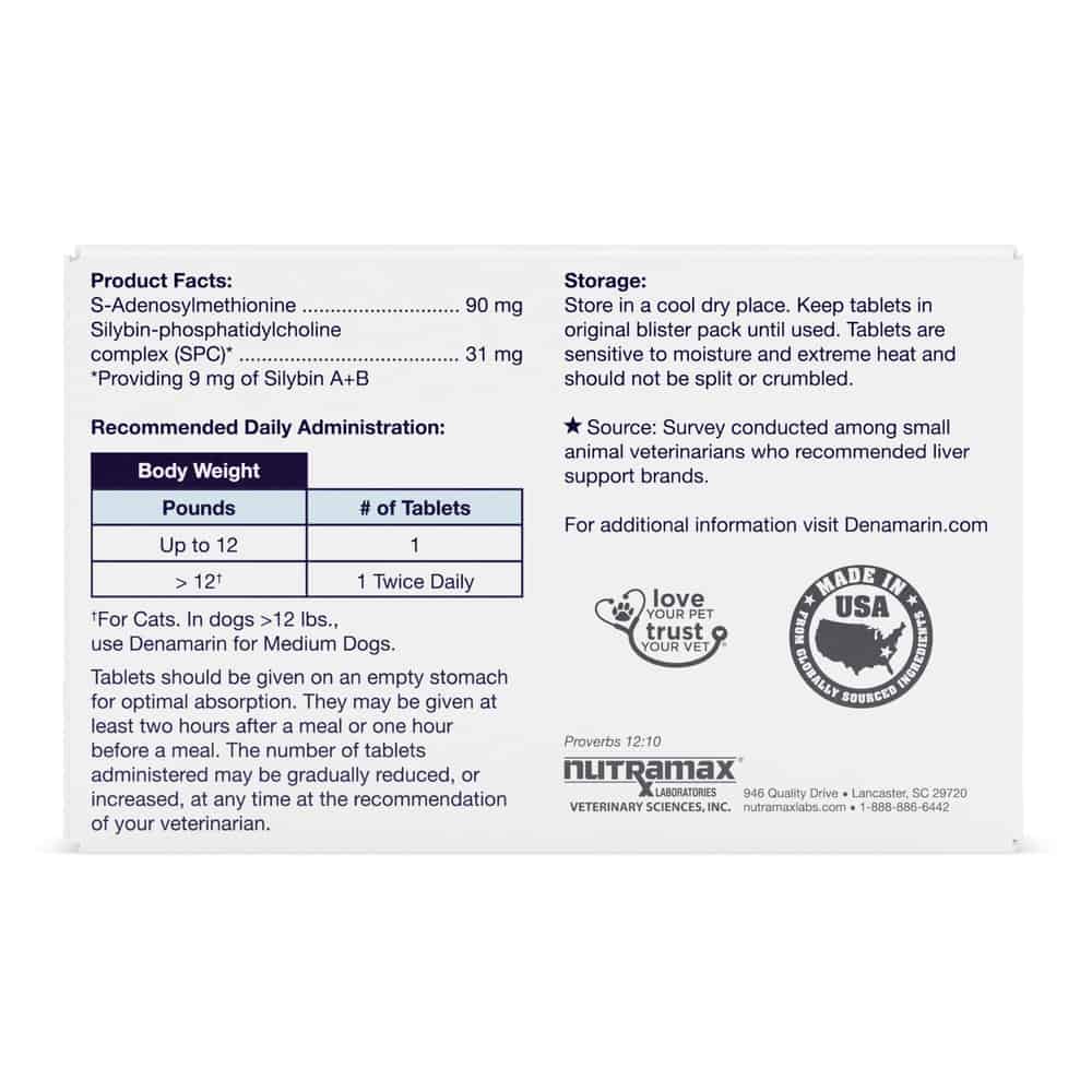 Denamarin coated tablets containing SAMe (s-adenosylmethionine) and silybin can be used in dogs and cats of all sizes to help support healthy liver functions. In addition, research has shown the administration of Denamarin coated tablets to be safe for dogs and cats. Denamarin Liver Health Supplements are brought to you by Nutramax Laboratories Veterinary Sciences, the #1 veterinarian recommended supplement company. *Source: Survey conducted among small animal veterinarians who recommended animal supplements.