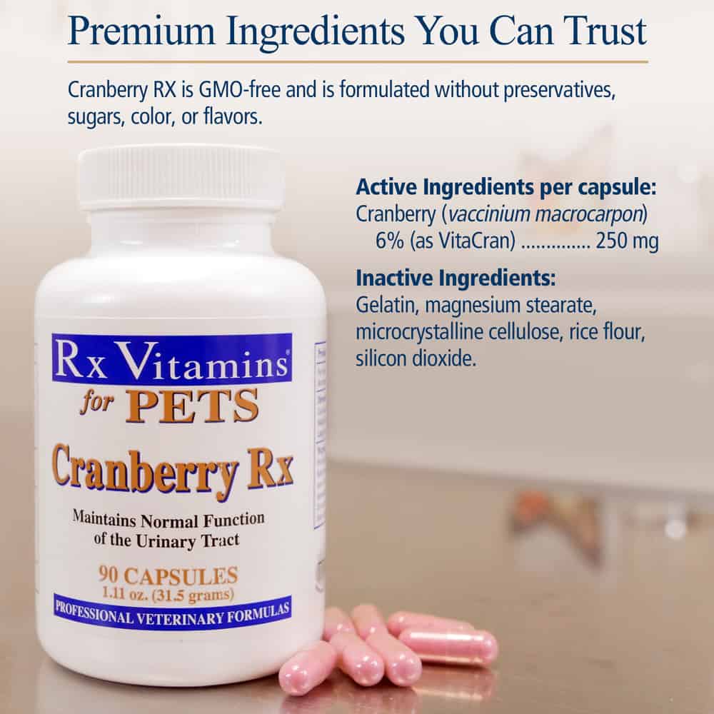 Rx Vitamins for Pets Cranberry Rx for Dogs & Cats could potentially act to relieve certain symptoms associated with minor urinary tract infections (UTIs) in dogs and cats. Specifically, every capsule of Cranberry Rx contains 250 milligrams of cranberry extract‚ which contains plant chemicals called proanthocyanidins that might work to discourage some forms of bacteria from adhering to the walls of your pet’s bladder.