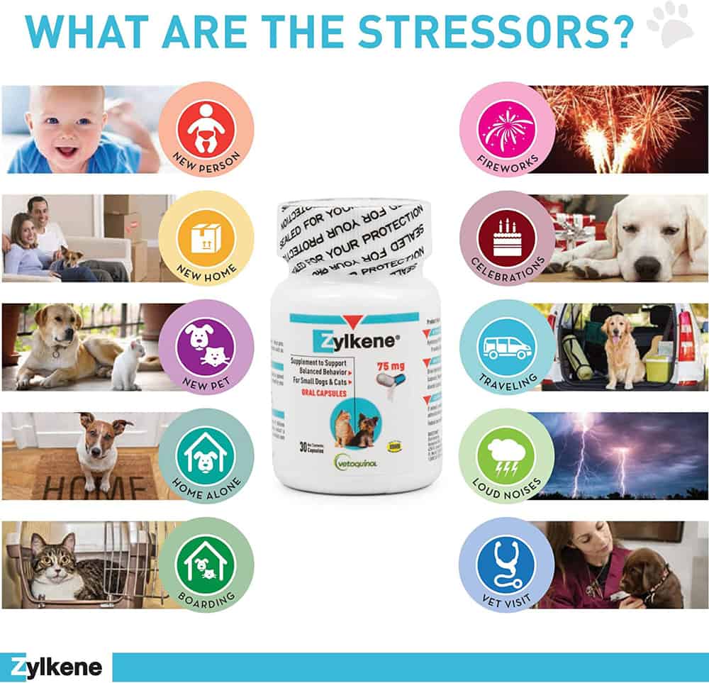 Zylkene aids in balancing your pet's reaction to stressful situations, and is particularly useful to keep pets calm during travel, adoption, fireworks and other loud noises, grooming, and meeting new people. Simply administer the recommended dosage directly by mouth or open capsules and mix the contents with your pet's favorite food. Administration should begin 1-2 days prior to anticipated stressful events or changes in your pet's environment. Some pets may require earlier administration (5-7 days).