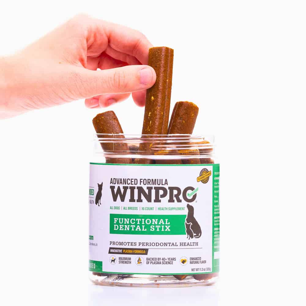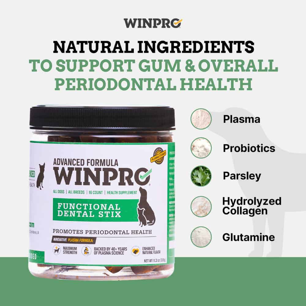 Winpro Dental Stix work by combining mechanical chewing action with bioactive plasma proteins that target harmful oral bacteria and inflammation. The stix texture helps scrape away plaque and tartar, while functional ingredients support gum health and fresh breath. Regular use ensures cleaner teeth, healthier gums, and improved oral hygiene.