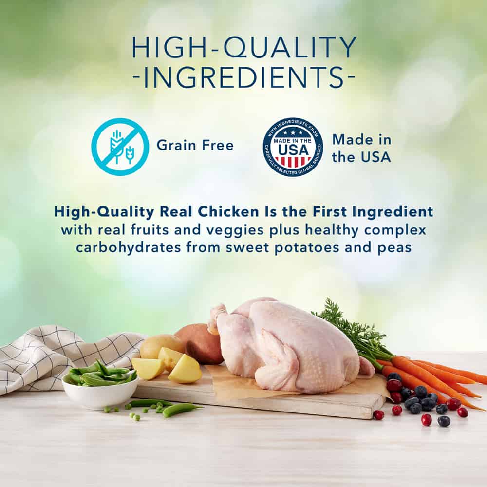 | Deboned Chicken, Potatoes, Peas, Pea Starch, Chicken Meal, Potato Starch, Tapioca Starch, Dried Tomato Pomace, Natural Flavor, Flaxseed (source of Omega 3 and 6 Fatty Acids), Pea Fiber, Chicken Fat (preserved with Mixed Tocopherols), Pea Protein, Fish Oil (source of DHA-Docosahexaenoic Acid), Dicalcium Phosphate, Dehydrated Alfalfa Meal, Potassium Chloride, Choline Chloride, Dried Chicory Root, Alfalfa Nutrient Concentrate, Calcium Carbonate, DL-Methionine, Salt, Taurine, Vitamin E Supplement, preserved with Mixed Tocopherols, Sweet Potatoes, Carrots, L-Ascorbyl-2-Polyphosphate (source of Vitamin C), Garlic, L-Carnitine, Glucosamine Hydrochloride, Zinc Amino Acid Chelate, Zinc Sulfate, Vegetable Juice for color, Ferrous Sulfate, Iron Amino Acid Chelate, Blueberries, Cranberries, Barley Grass, Parsley, Turmeric, Dried Kelp, Yucca Schidigera Extract, Niacin (Vitamin B3), Calcium Pantothenate (Vitamin B5), L-Lysine, Copper Sulfate, Biotin (Vitamin B7), Vitamin A Supplement, Copper Amino Acid Chelate, Manganese Sulfate, Chondroitin Sulfate, Manganese Amino Acid Chelate, Thiamine Mononitrate (Vitamin B1), Riboflavin (Vitamin B2), Vitamin D3 Supplement, Vitamin B12 Supplement, Pyridoxine Hydrochloride (Vitamin B6), Calcium Iodate, Dried Yeast, Dried Enterococcus faecium fermentation product, Dried Lactobacillus acidophilus fermentation product, Dried Aspergillus niger fermentation extract, Dried Trichoderma longibrachiatum fermentation extract, Dried Bacillus subtilis fermentation extract, Folic Acid (Vitamin B9), Sodium Selenite, Oil of Rosemary |