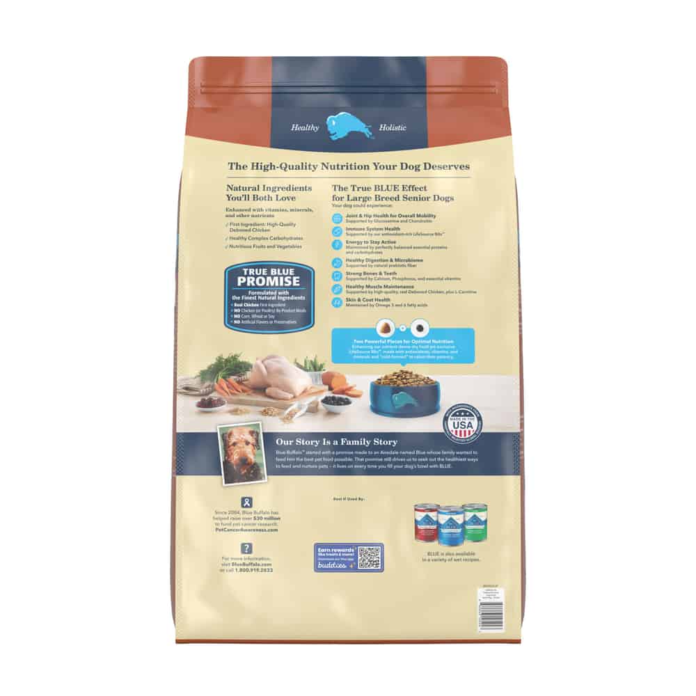 Formulated for the health and well-being of large breed senior dogs, plus glucosamine and chondroitin to support the joint health and mobility needs of large, older dogs. BLUE Life Protection Formula with LifeSource Bits will provide your dog with superior nutrition plus a unique nutrient and antioxidant package specifically formulated for his needs.