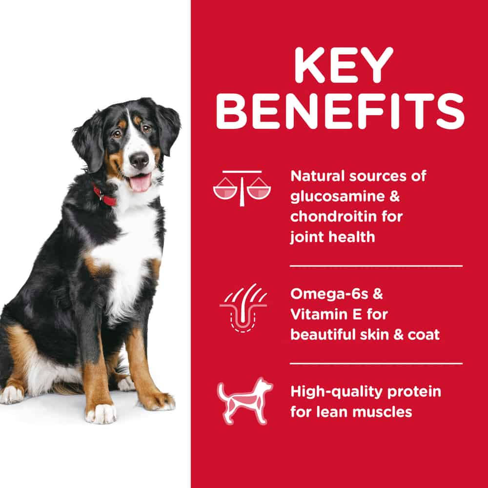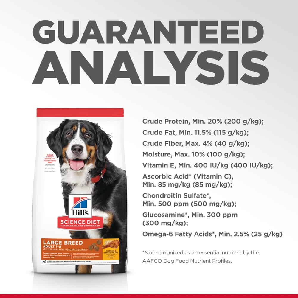 Hill's Science Diet Large Breed Adult dry dog food is specially formulated to fuel the energy needs of large breed dogs during the prime of their life. The protein of real chicken with energy from brown rice and fiber from barley, this food is packed with Omega-6s & Vitamin E to maintain a beautiful skin & coat, plus glucosamine and chondroitin keep their joints healthy and limber.