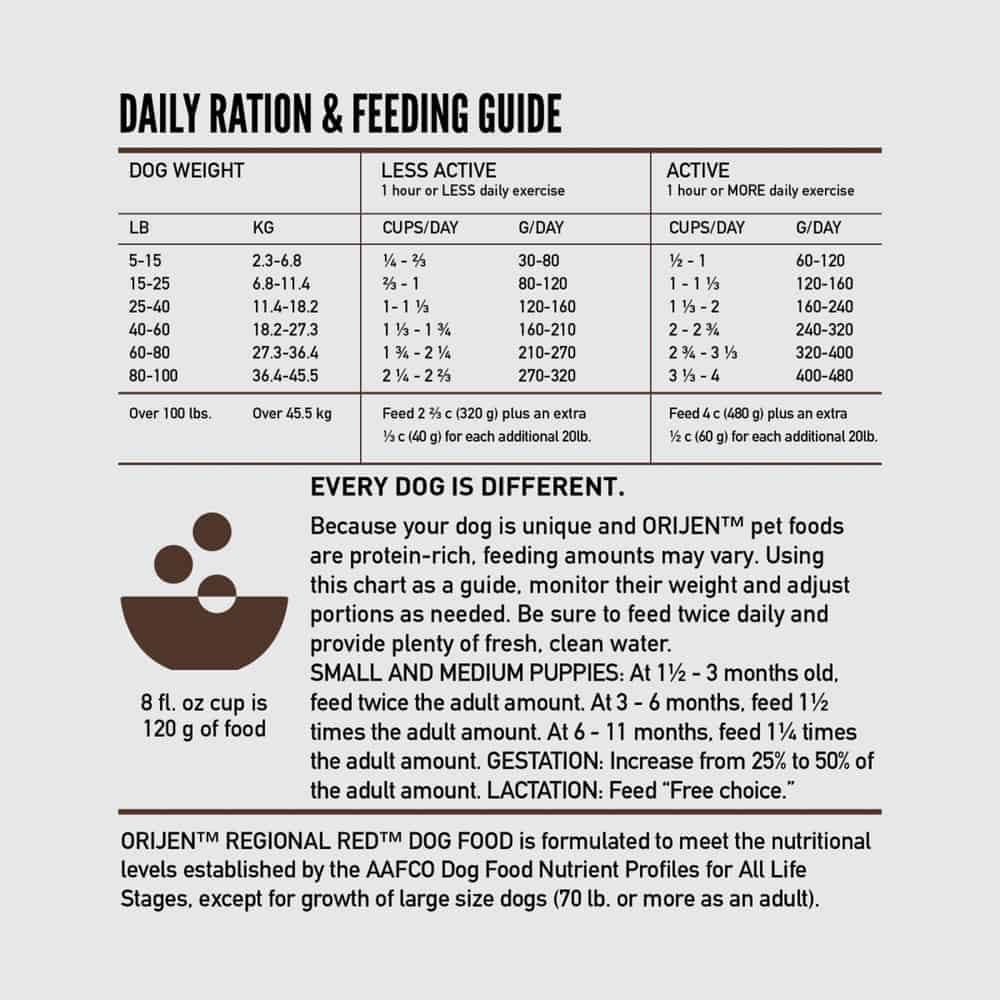- Because your dog is unique and ORIJEN™ pet foods are packed with animal protein, feeding requirements will vary with breed, environment, age and activity.
