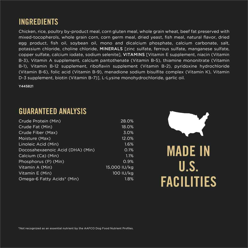 | Chicken, Rice, Poultry By-Product Meal, Corn Gluten Meal, Whole Grain Wheat, Beef Fat Preserved With Mixed-Tocopherols, Whole Grain Corn, Corn Germ Meal, Dried Yeast, Fish Meal, Natural Flavor, Dried Egg Product, Fish Oil, Soybean Oil, Mono And Dicalcium Phosphate, Calcium Carbonate, Salt, Potassium Chloride, Choline Chloride, Minerals [Zinc Sulfate, Ferrous Sulfate, Manganese Sulfate, Copper Sulfate, Calcium Iodate, Sodium Selenite], Vitamins [Vitamin E Supplement, Niacin (Vitamin B-3), Vitamin A Supplement, Calcium Pantothenate (Vitamin B-5), Thiamine Mononitrate (Vitamin B-1), Vitamin B-12 Supplement, Riboflavin Supplement (Vitamin B-2), Pyridoxine Hydrochloride (Vitamin B-6), Folic Acid (Vitamin B-9), Menadione Sodium Bisulfite Complex (Vitamin K), Vitamin D-3 Supplement, Biotin (Vitamin B-7)], L-Lysine Monohydrochloride, Garlic Oil. Y445821 |