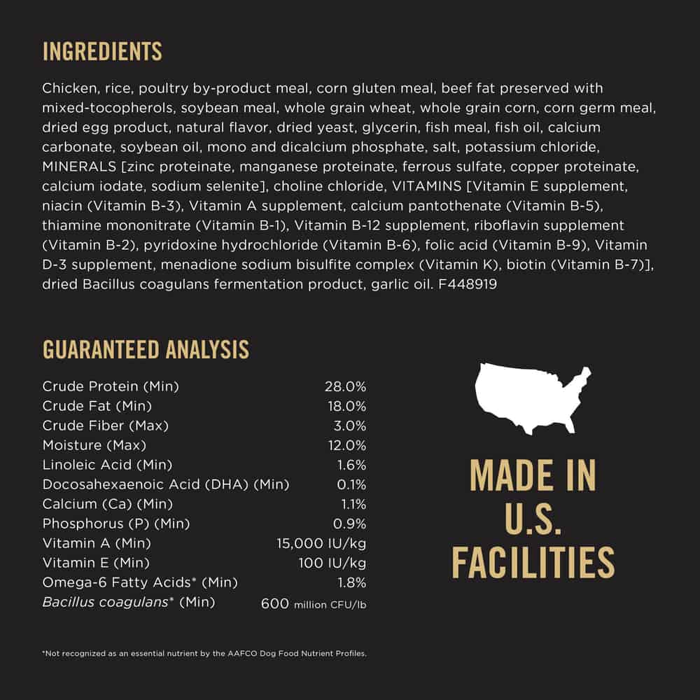 | Chicken, Rice, Poultry By-Product Meal, Corn Gluten Meal, Beef Fat Preserved With Mixed-tocopherols, Soybean Meal, Whole Grain Wheat, Whole Grain Corn, Corn Germ Meal, Dried Egg Product, Natural Flavor, Dried Yeast, Glycerin, Fish Meal, Fish Oil, Calcium Carbonate, Soybean Oil, Mono And Dicalcium Phosphate, Salt, Potassium Chloride, Minerals [Zinc Proteinate, Manganese Proteinate, Ferrous Sulfate, Copper Proteinate, Calcium Iodate, Sodium Selenite], Choline Chloride, Vitamins [Vitamin E Supplement, Niacin (Vitamin B-3), Vitamin A Supplement, Calcium Pantothenate (Vitamin B-5), Thiamine Mononitrate (Vitamin B-1), Vitamin B-12 Supplement, Riboflavin Supplement (Vitamin B-2), Pyridoxine Hydrochloride (Vitamin B-6), Folic Acid (Vitamin B-9), Vitamin D-3 Supplement, Menadione Sodium Bisulfite Complex (Vitamin K), Biotin (Vitamin B-7)], Dried Bacillus Coagulans Fermentation Product, Garlic Oil. F448919 |
