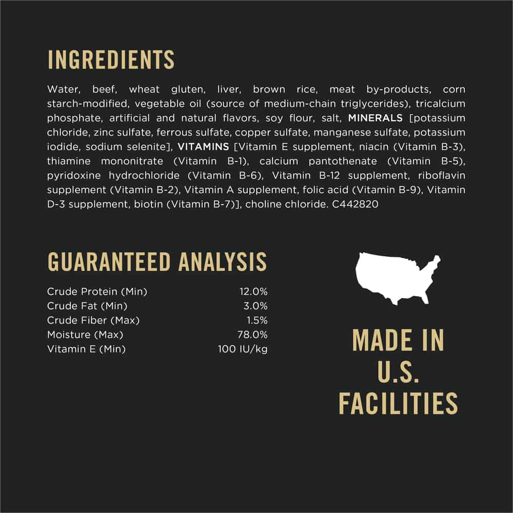| Water, Beef, Wheat Gluten, Liver, Brown Rice, Meat By-Products, Corn Starch-Modified, Vegetable Oil (Source Of Medium-Chain Triglycerides), Tricalcium Phosphate, Artificial And Natural Flavors, Soy Flour, Salt, MINERALS [Potassium Chloride, Zinc Sulfate, Ferrous Sulfate, Copper Sulfate, Manganese Sulfate, Potassium Iodide, Sodium Selenite], VITAMINS [Vitamin E Supplement, Niacin (Vitamin B-3), Thiamine Mononitrate (Vitamin B-1), Calcium Pantothenate (Vitamin B-5), Pyridoxine Hydrochloride (Vitamin B-6), Vitamin B-12 Supplement, Riboflavin Supplement (Vitamin B-2), Vitamin A Supplement, Folic Acid (Vitamin B-9), Vitamin D-3 Supplement, Biotin (Vitamin B-7)], Choline Chloride. C442820 |
