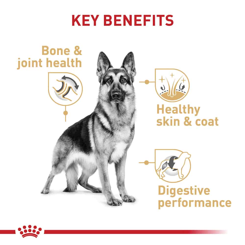 - FORMULATED FOR PUREBRED GERMAN SHEPHERDS: Royal Canin Breed Health Nutrition German Shepherd Adult Dog Food Dry Formula for purebred German Shepherds 15 months and older