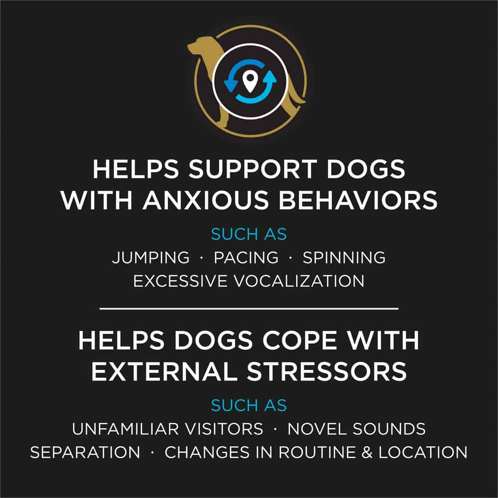 Purina Calming Care is a probiotic supplement for dogs that helps dogs maintain calm behavior. It can help dogs cope with external stressors like separation anxiety, unfamiliar visitors, new sounds, or changes in routine and location. Purina Calming Care also helps promote a positive state in dogs and helps maintain positive cardiac activity during stressful events. This tasty supplement comes in individual packets that are easy to administer.