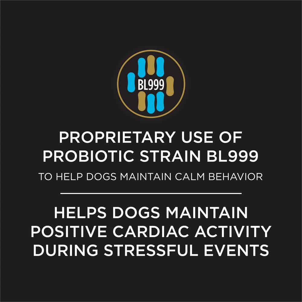 Purina Calming Care contains a probiotic strain containing 1 X 109 CFU microorganisms per packet that is shown to help dogs maintain a calm behavior. It may take six weeks to see results.