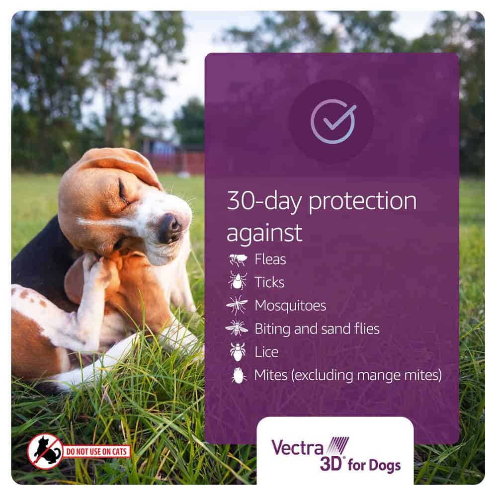 Vectra 3D is a topical solution for dogs and puppies over 8 weeks old, providing effective control of fleas, ticks, and mosquitoes for a month. It is an over-the-counter topical that begins reducing flea feeding in just 5 minutes. Vectra 3D repels and kills ticks (Brown dog ticks, American dog ticks, Deer ticks, Gulf Coast ticks, and Lone Star ticks) that may transmit Lyme disease, Rocky Mountain spotted fever, babesiosis, ehrlichiosis, bartonellosis, hepatozoonosis, and anaplasmosis for one month. It also repels and kills fleas that can cause flea allergy dermatitis, mosquitoes that may transmit vector-borne disease, biting and sand flies, lice, and mites for one month. Vectra 3D also prevents all flea stages (eggs, pupae, larvae, and adult fleas) from developing. The long-lasting topical remains effective after bathing and swimming.