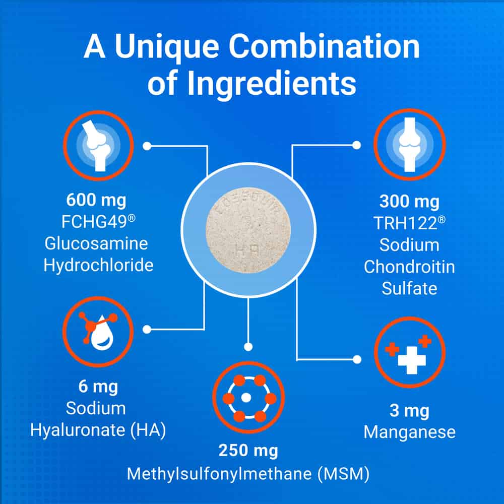 - With Hyaluronic Acid - Each chewable tablet also contains Hyaluronic Acid (HA), a major component of joint fluid, which helps keep joints moving smoothly.